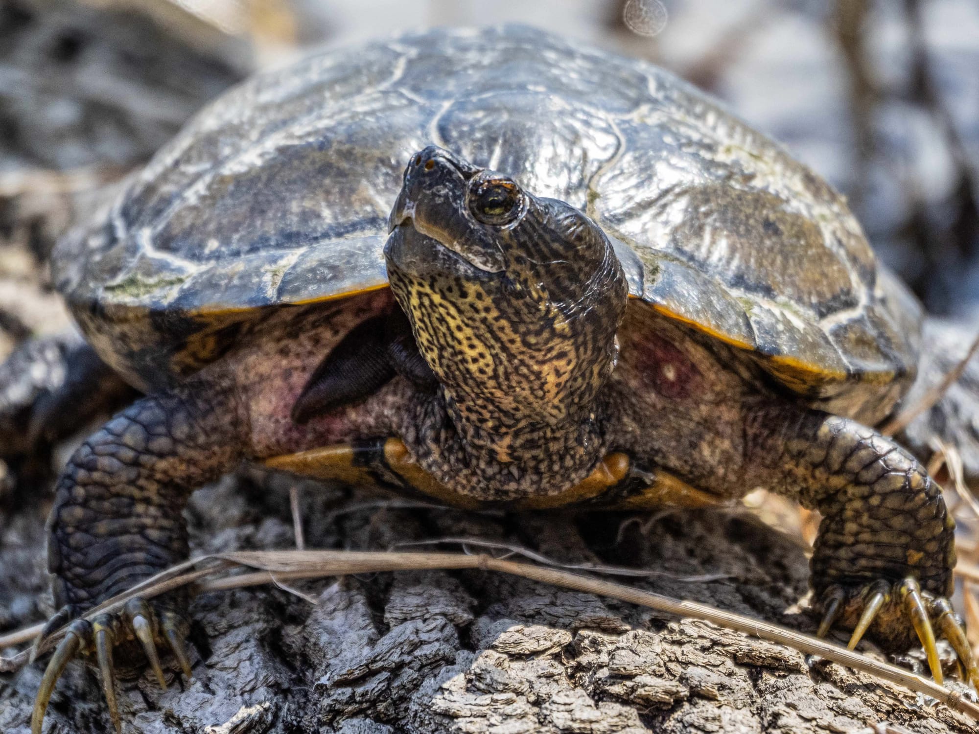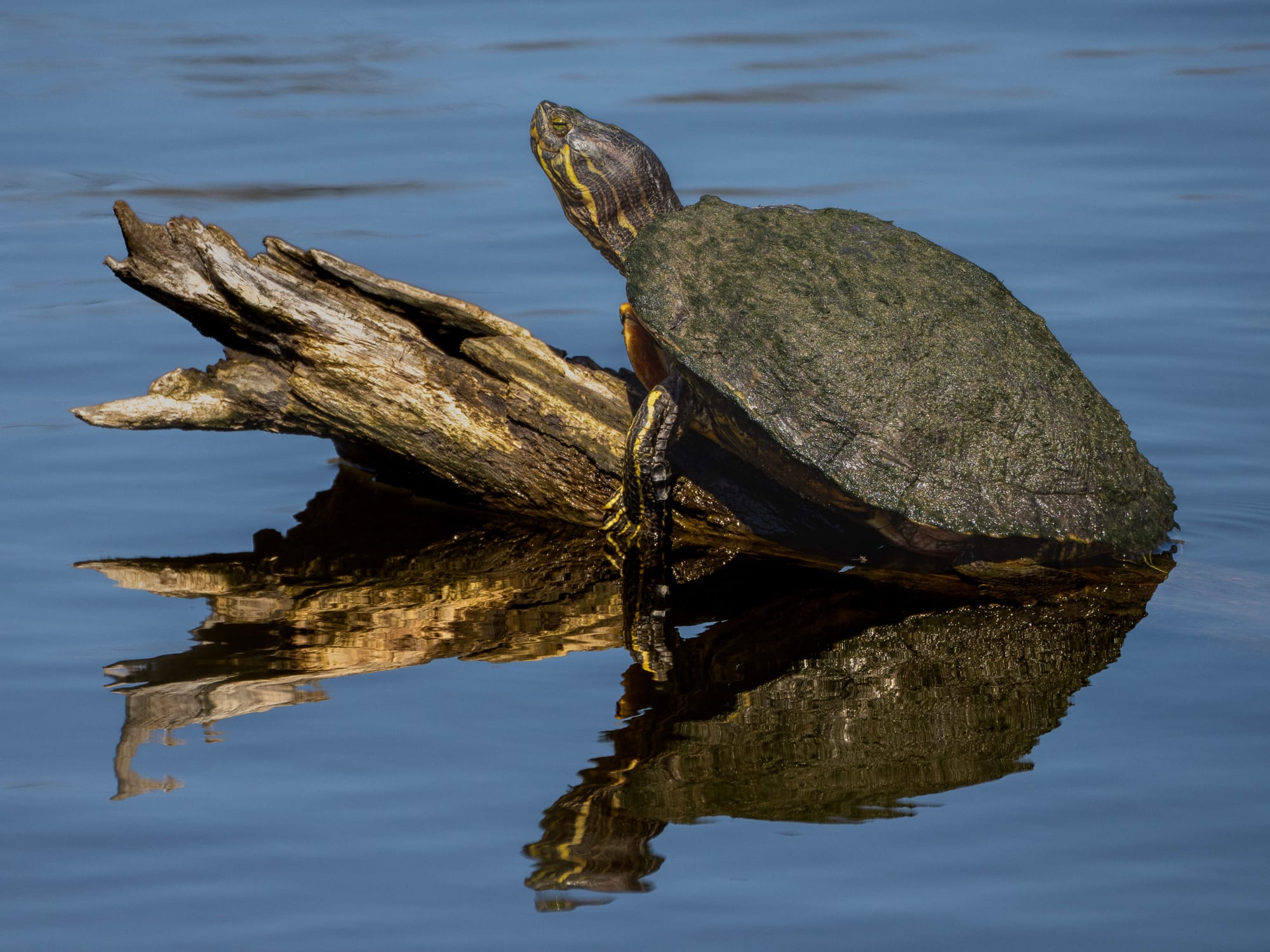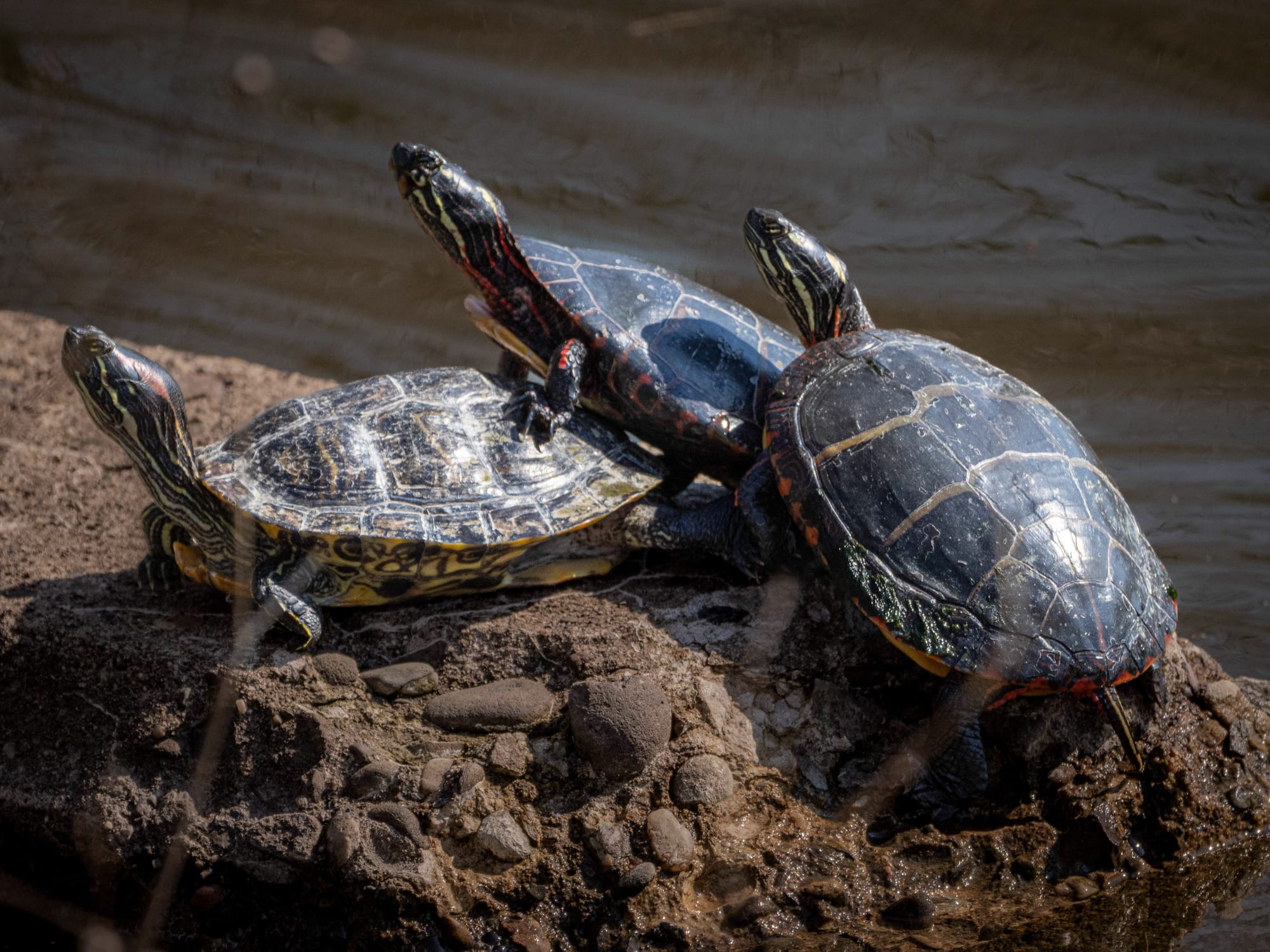 The turtle pile-ups are in full swing as ideal basking spots become crowded. One of the older Red-Eared sliders (probably 15-20 years old), with a coat of winter algae, A Red-eared Slider and two Painted Turtles. Pond Slider and an Eastern Musk turtle each with a good-sized Turtle leech - one on the right shoulder area of the pond slider, and one to the rear edge of the musk turtle.