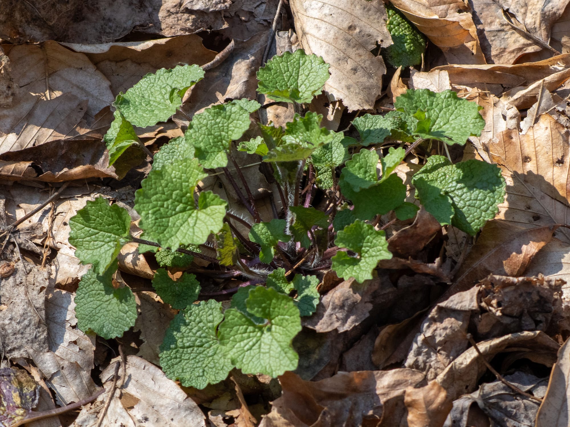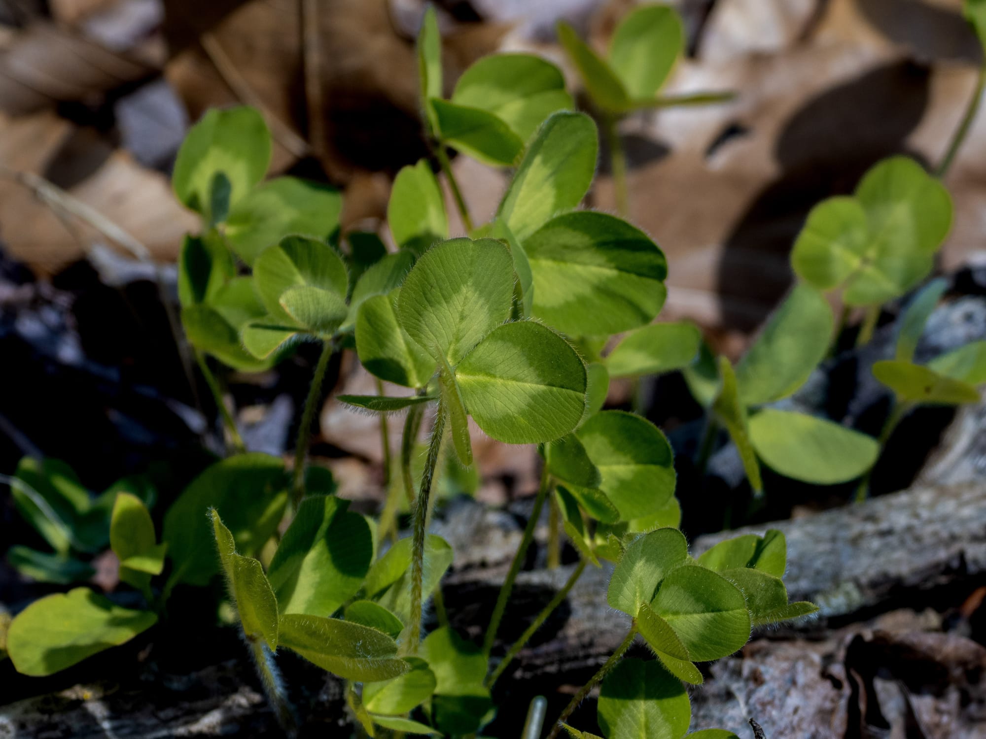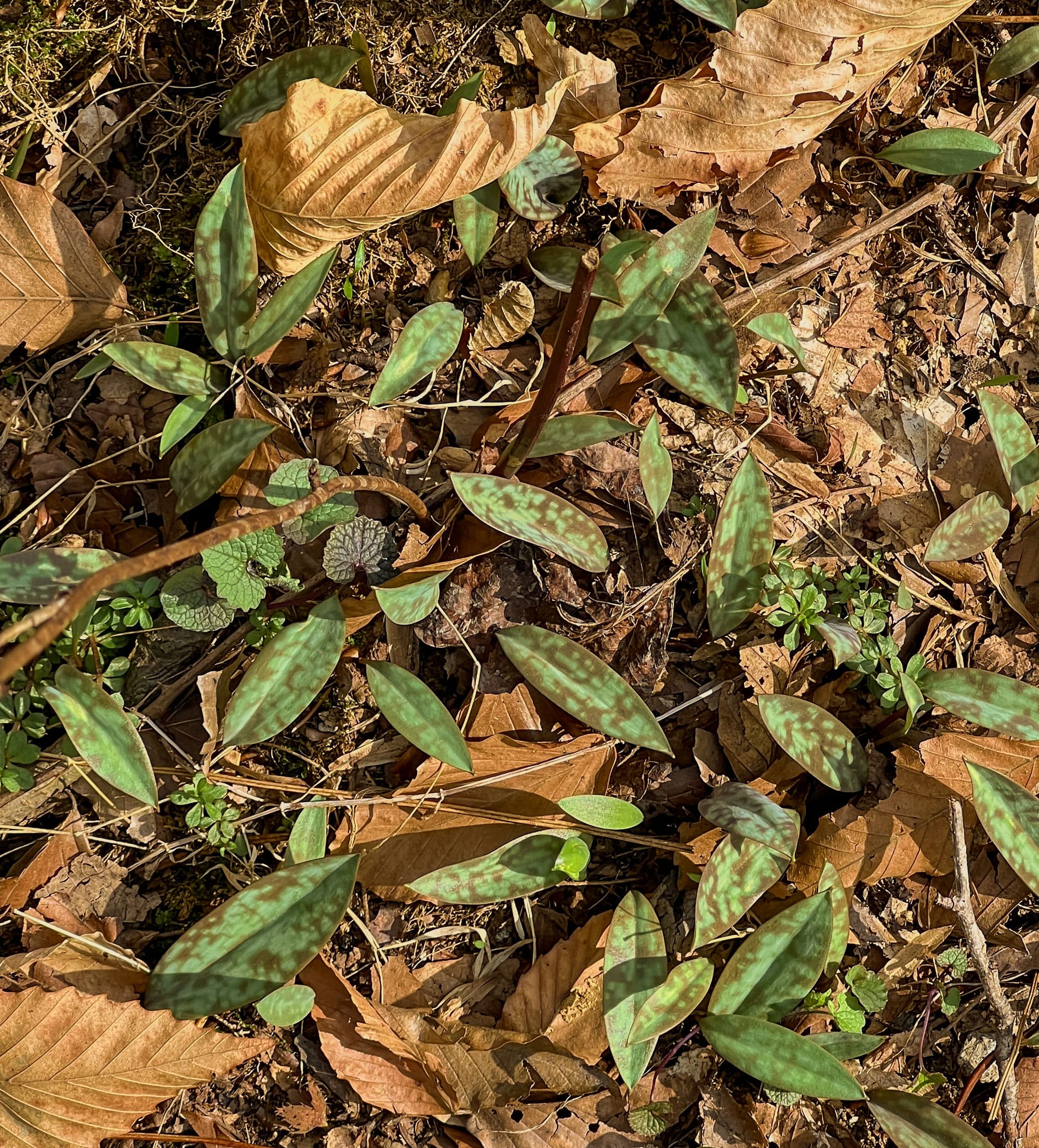 Mayapple unfolding its umbrella-like leaves, Garlic Mustard, Red Clover and Trout Lily all punching trough the leaf litter.