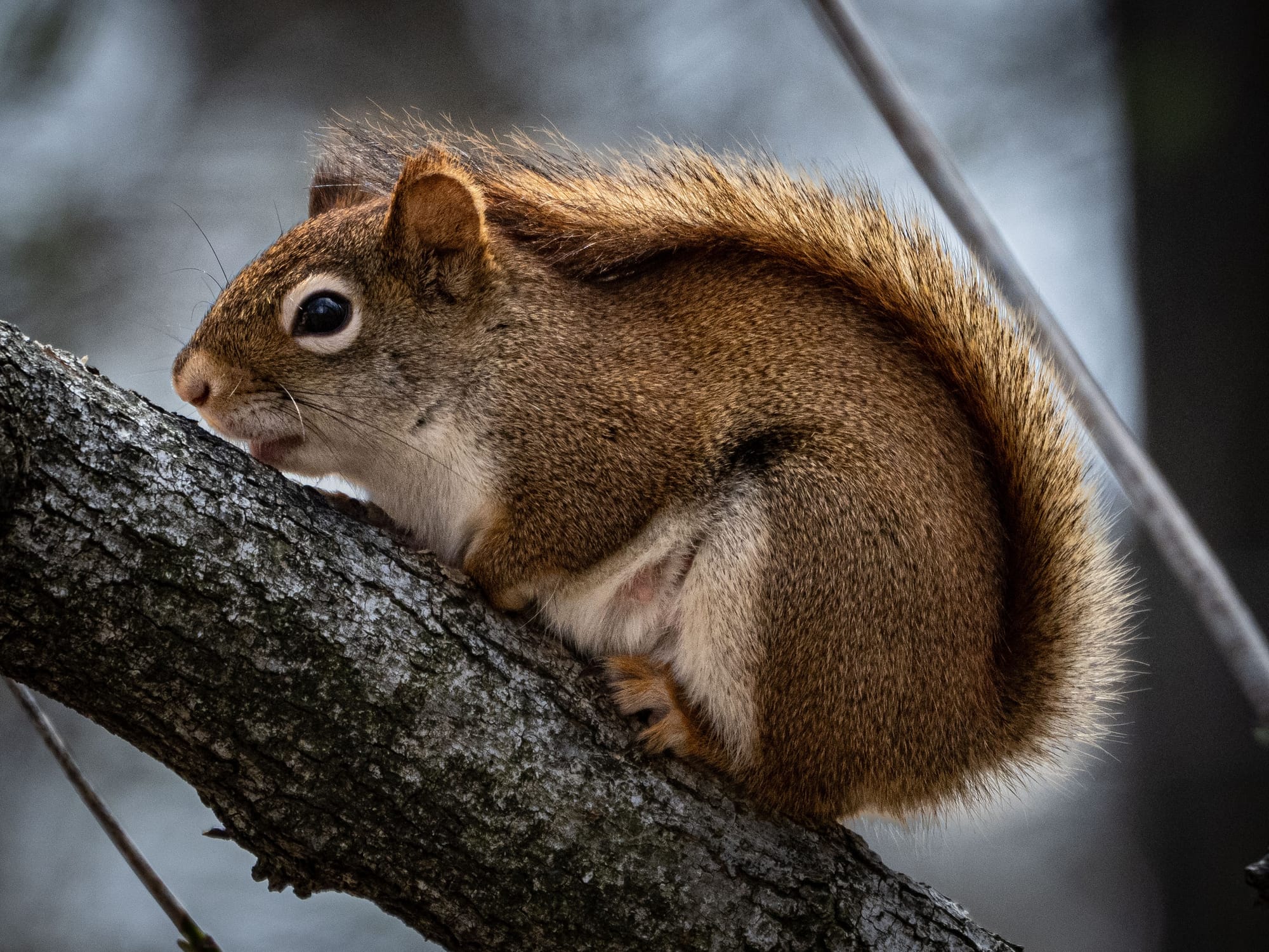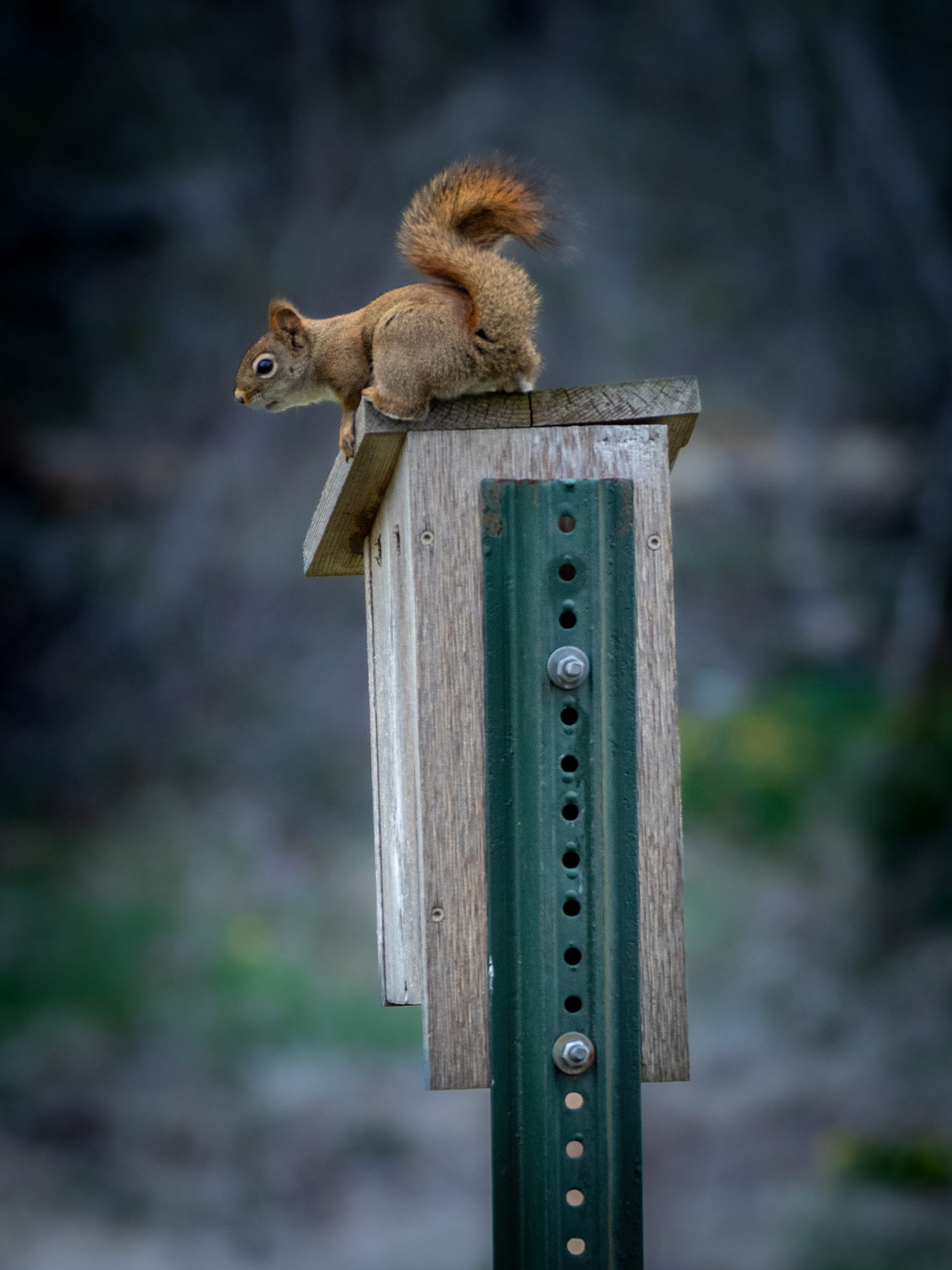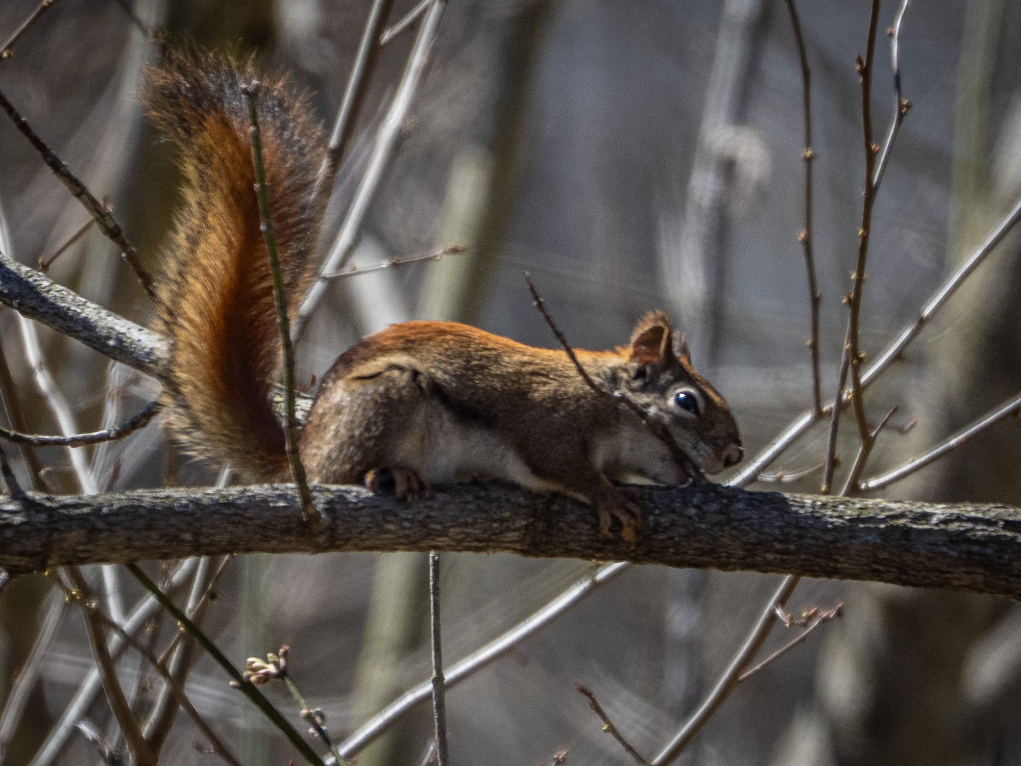 Red Squirrels are browsing for fresh shoots, buds and flowers on trees, a nursing mother during a break, Investigating a nest box.