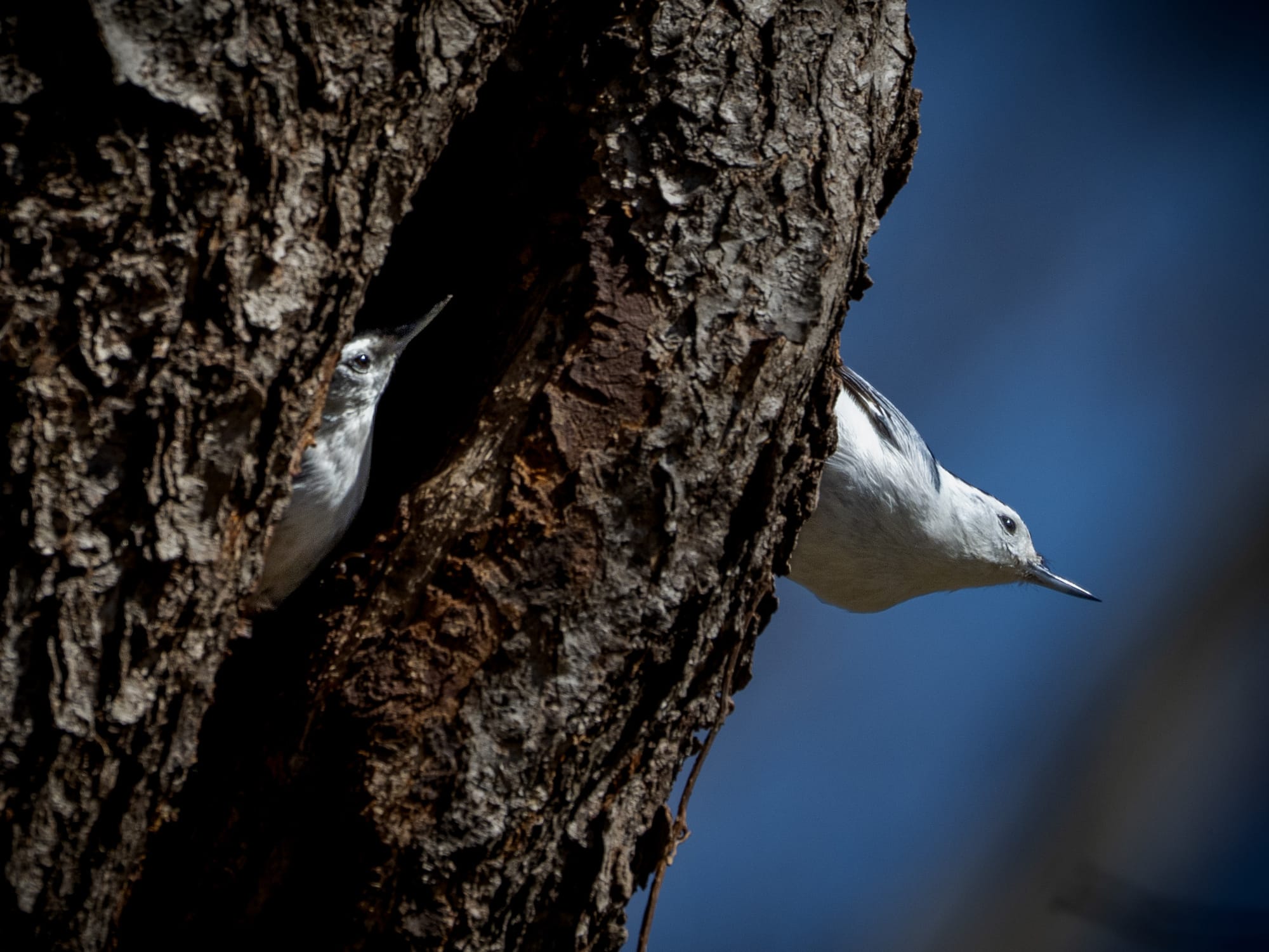 This pair of White-breasted Nuthatches appeared to be shopping for a nesting spot.
