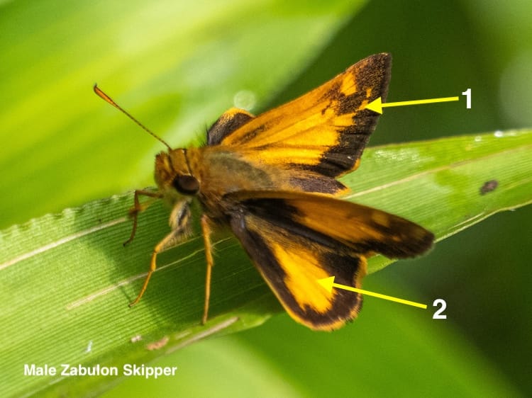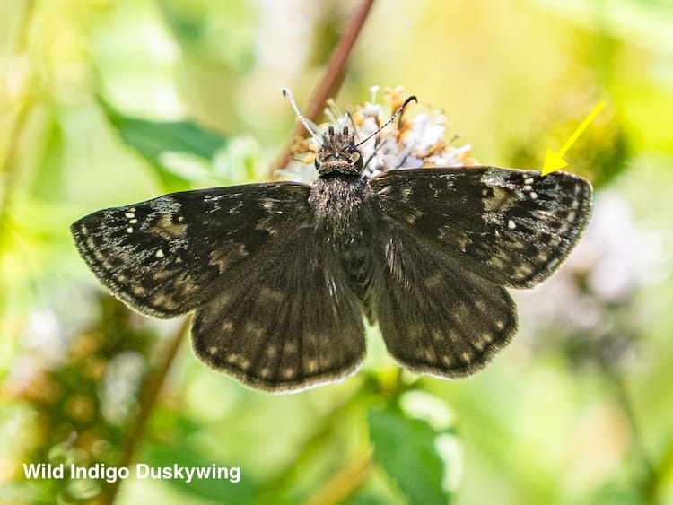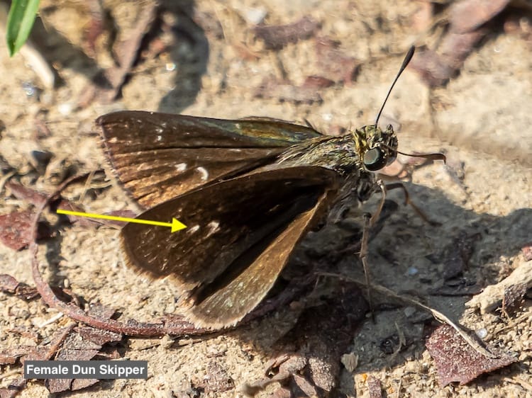 I've only spotted this skipper a handful of times, it's much darker than the others, rests with it's wings flat, and has the white markings at the top outside of the forewing indicated by the arrow. It's not likely you'll confuse it with another skipper. Duskywing species are very difficult to tell apart, and the males and females are almost identical.