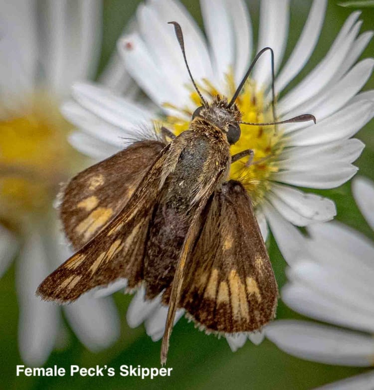 The male is brighter and both sexes have geometric patterns on both the hind and fore wings. The pattern on both sets of wings makes the Peck's skipper different from other skippers you'll find at the park.
