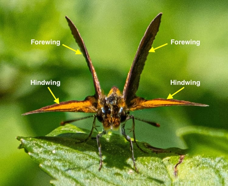 Subfamily Hesperiinae usually hold their forewings in a V-shape and their hindwings flat when at rest; known at the "jet fighter" orientation. These are the most common group of skippers at the park.