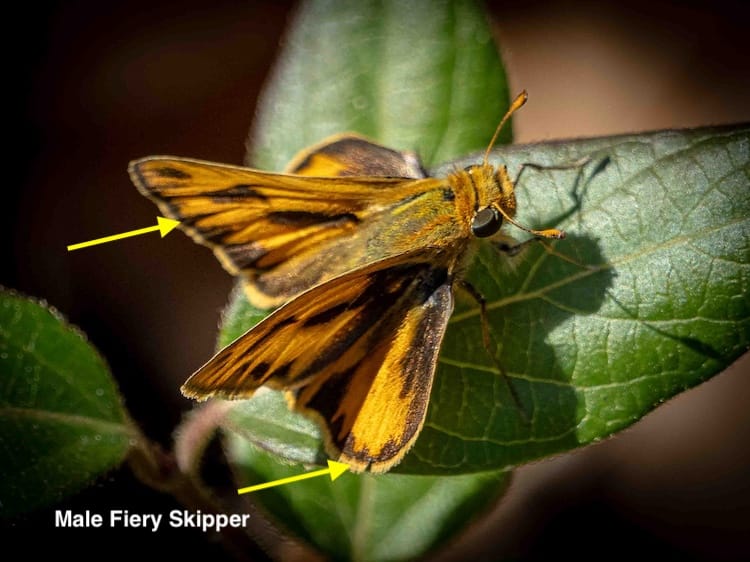 The male Fiery Skipper has a jagged black border on it's bright orange fore and hind wings. Females are a almost the male pattern reversed, few geometric orange markings on a filed of dark brown. (I have yet to get a picture of the female Fiery Skipper.)