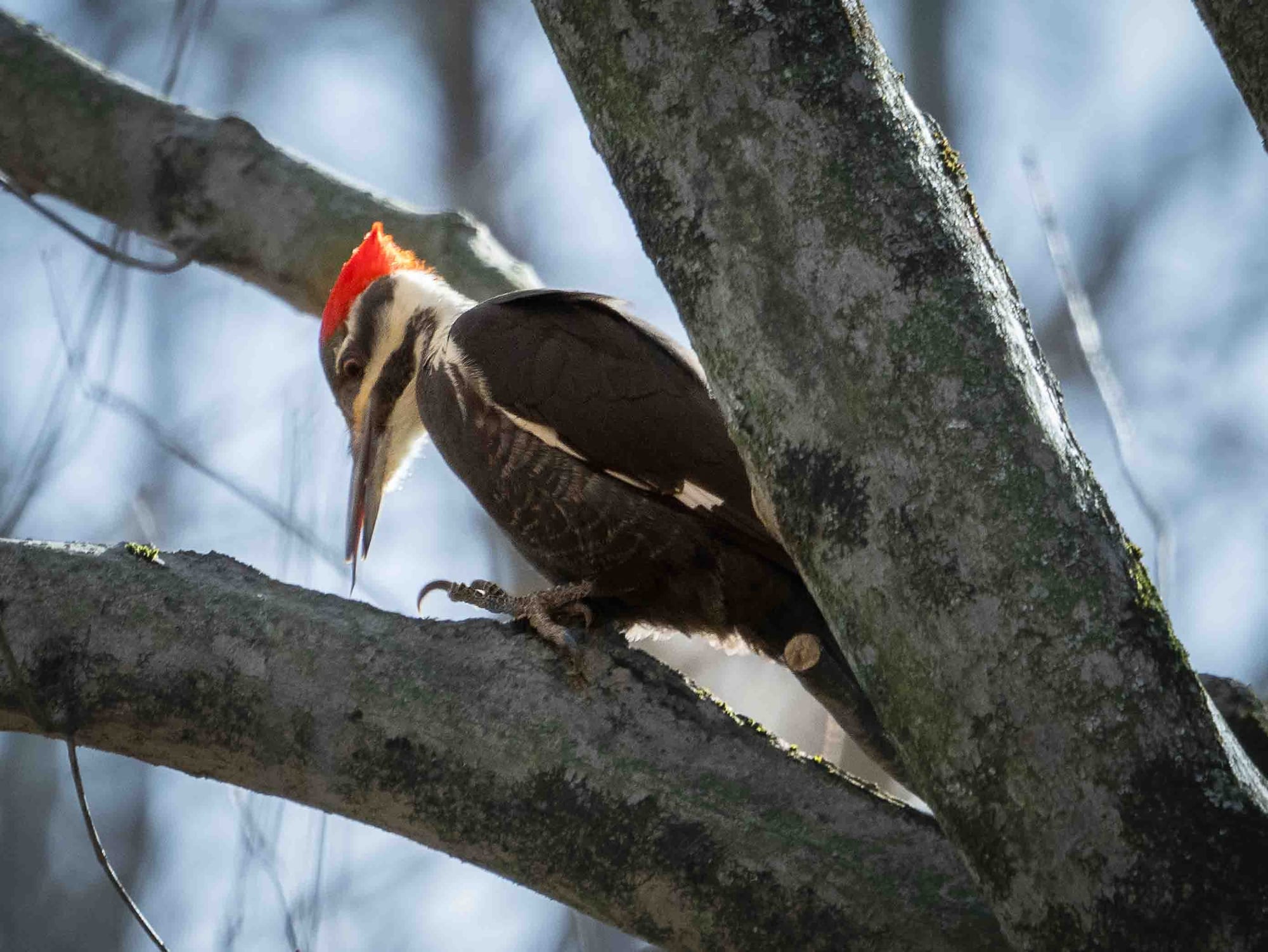 At first, it's hard to believe that such a big, loud, and demanding prescence calls our woods home. You might hear loud drumming or a "kuk-kuk-kuk" sound, or notice rectangular excavations in trees made while searching for carpenter ants, before catching a glimpse of the real culprit – the Pileated Woodpecker.