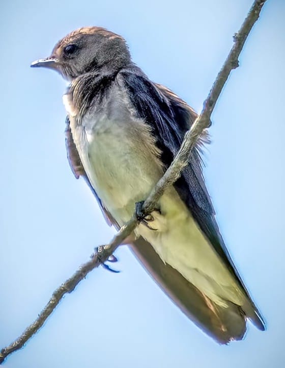 Plain brown upperparts, a dusky throat, and a white belly. Its tail is squared-off, not forked. They are not social nesters and do not dig their own burrows, instead using existing tunnels from kingfishers in creek banks or holes in structures like drainpipes. Arrives in April. After breeding season, they begin their migration south towards the Gulf Coast and Central America, with most having left Pennsylvania by September.
