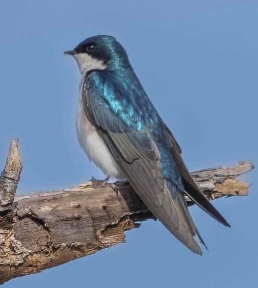 Iridescent, blue-green upperparts and bright white undersides. Cavity nesters, Tree Swallows depend on holes in dead trees or human-made nest boxes. Very social species that nests in colonies. Arrives mid-to-late March, very common throughout the summer, and migrate to the Gulf states and Central America by September or early October.