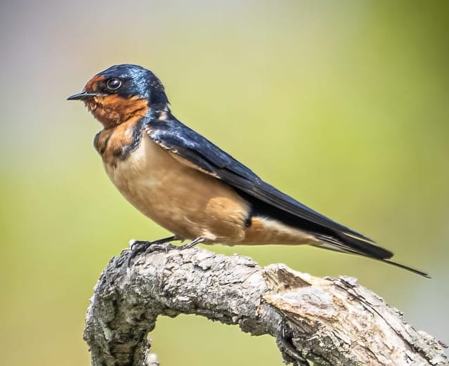 Glistening, dark blue back, reddish-orange throat, and long, deeply forked tail. This highly adaptable species lives in open habitats such as farmland, parks, and coastal waters. Barn Swallows are also colony nesters, building distinct cup-shaped nests from mud pellets on barns, under bridges, and in culverts. They are often seen flying very low to the ground or water, catching insects. Appear in mid-to-late April, common sight throughout the summer. In late summer forms large flocks and migrates to Central and South America, with most departing by late September.