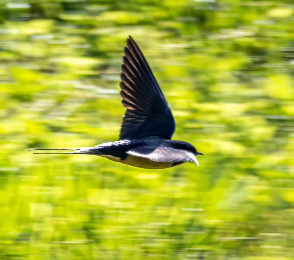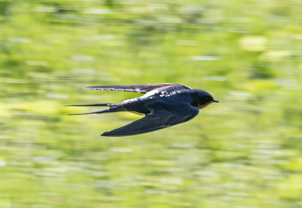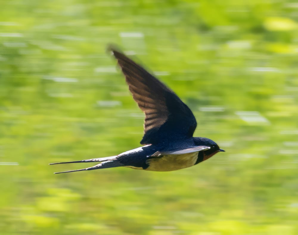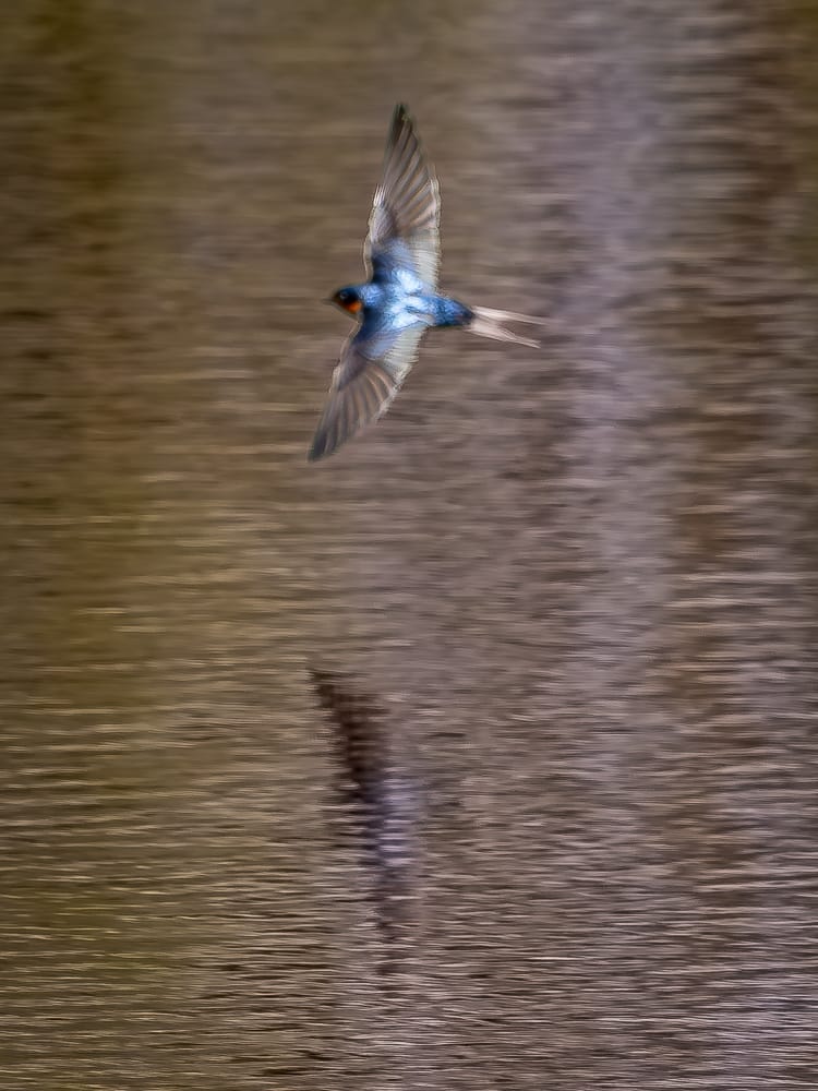 The Barn Swallow is the most widespread swallow species in the world. When foraging for insects in the water it zooms just inches above the surface at up to 45 miles an hour. It swoops down, dips its beak into the water, snatches its prey with lightning speed, quickly twists it's head upward to secure its catch, and glides on, a few ripples the only sign it was even there.