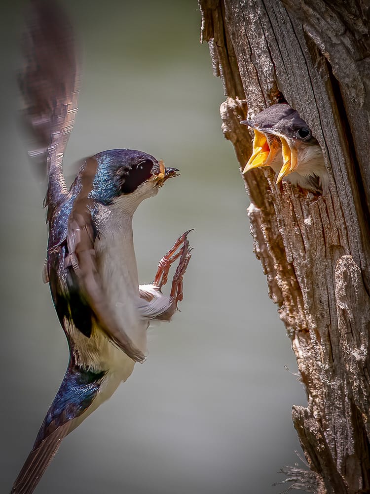 Tree Swallow feeding dragonfly to nestlings, It's not uncommon to see Tree Sallows perching in large groups near the ponds, Tree Swallows hawking for insects.