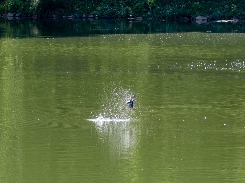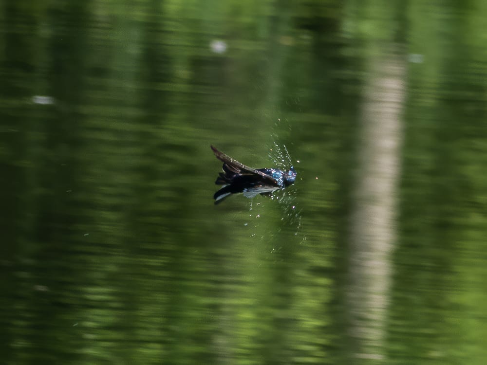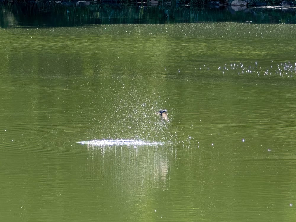 To bathe the swallow glides just over the surface, skims its belly in the water for a quick rinse, then flies upward, shaking off the droplets.