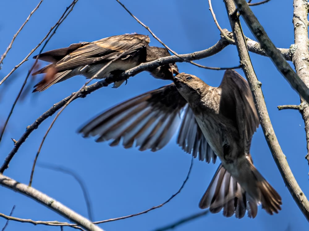 Immature Northern Rough-winged Swallows have light brown bands on their wings, Adult feeding a fledgling, a group of fledglings waiting to hone their flying skills near the pond.