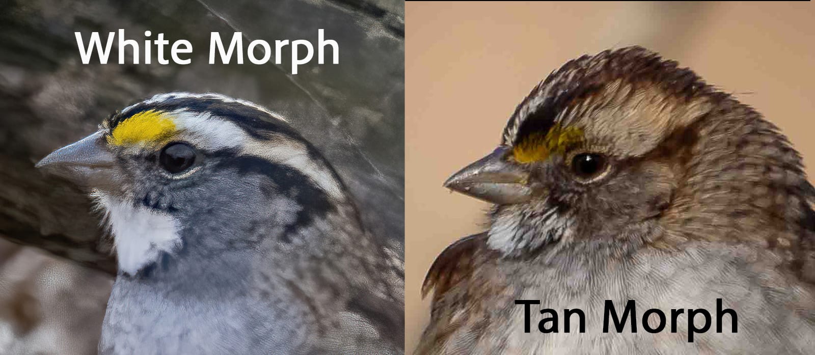 The white-throated sparrow has either white or tan stripes on its head, a white morph and a tan morph.