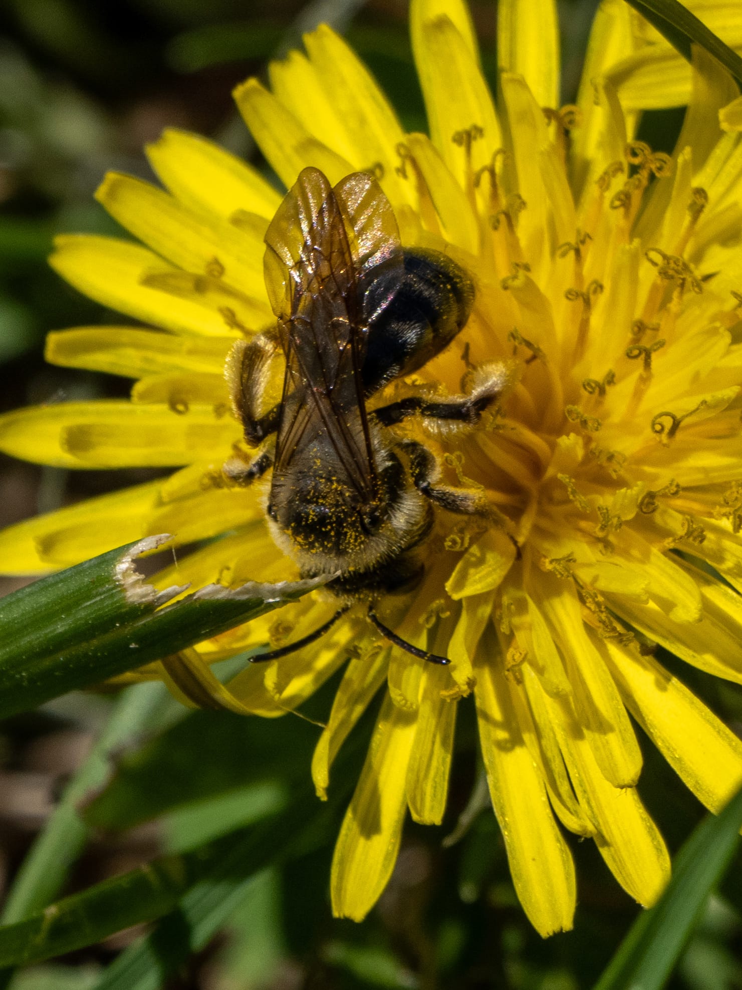 Carlin's Mining Bee (Andrena carlini) A medium-sized, dark, densely fuzzy mining bee, active in early spring. Like all mining bees, females dig individual burrows in the soil — often in the same patch of bare ground as many others, creating loose aggregations that can look almost social but aren't. Each bee is working entirely alone. Males emerge before females and can be seen patrolling low over the ground searching for mates. Cuckoo bees watch these aggregations for a chance to slip into an unattended nest and lay their eggs.