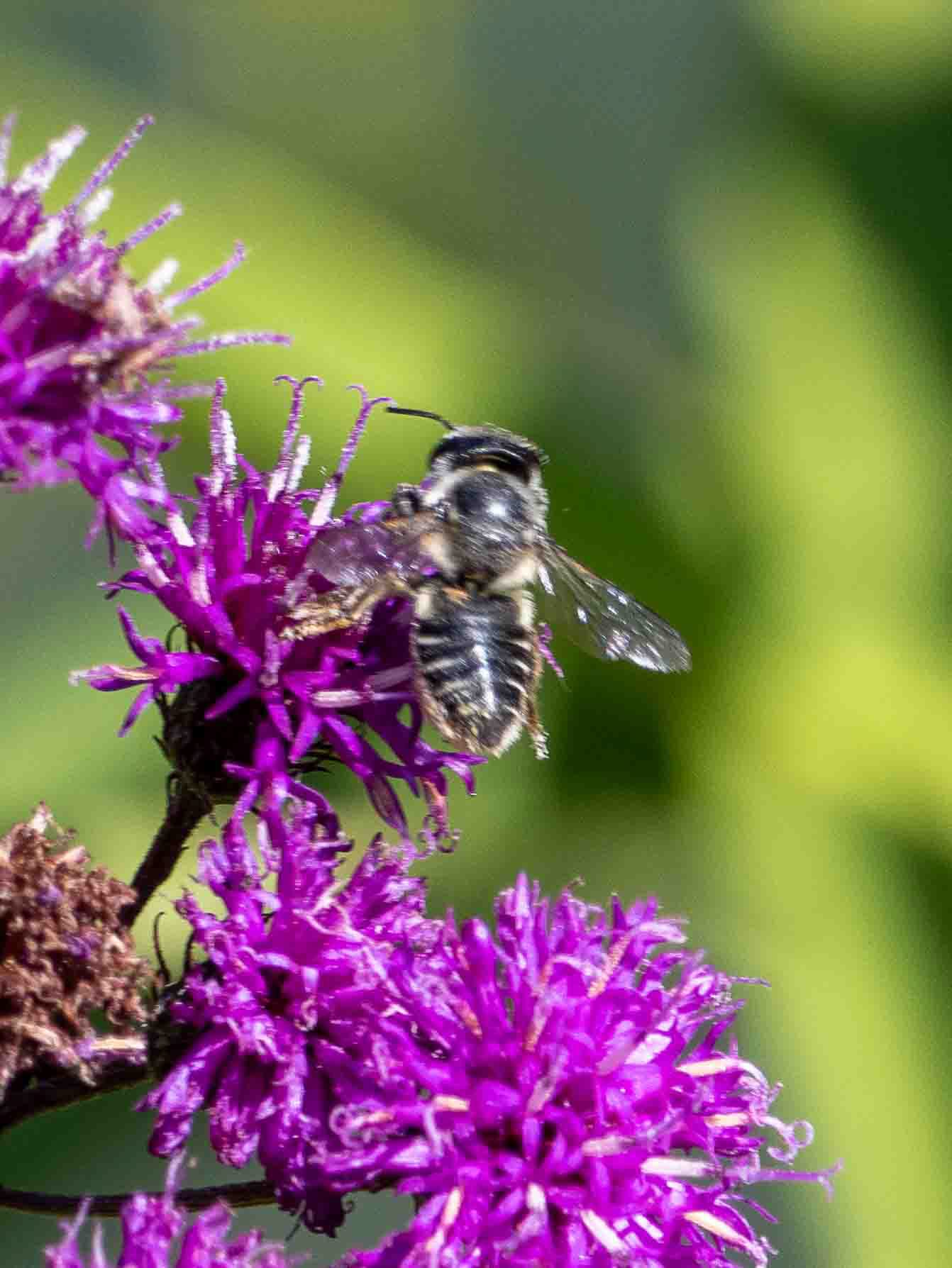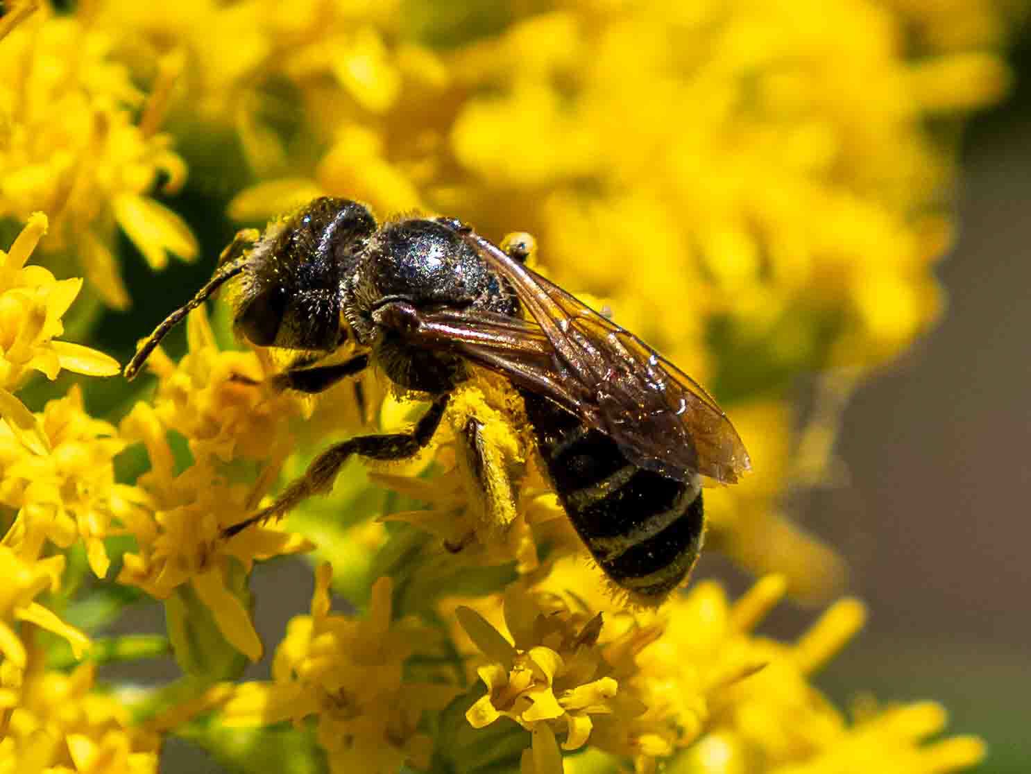 Ligated Furrow Bee (Halictus ligatus) Small and dark, with a furrow of pale hair bands across the abdomen. One of the few native bees that live in small social groups. A lone queen starts the nest in spring and raises the first round of workers, who build the colony through the summer. New queens appear in fall. Active across a long season on a wide range of flowers.