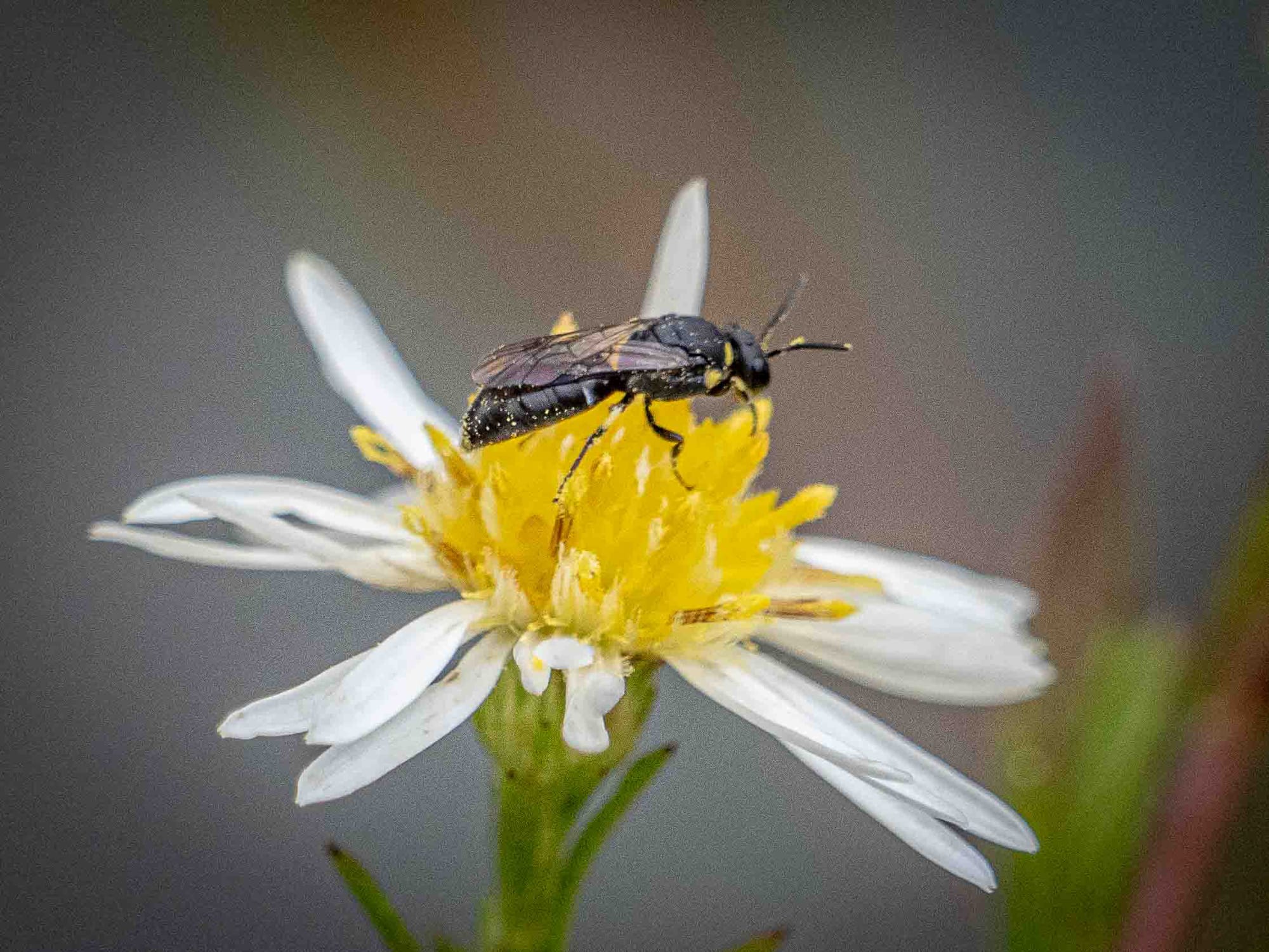 Modest Masked Bee (Hylaeus modestus) Small and slim, with yellow facial markings and almost no hair — easy to mistake for a small wasp. Nests in hollow stems or small cavities. Carries pollen internally.