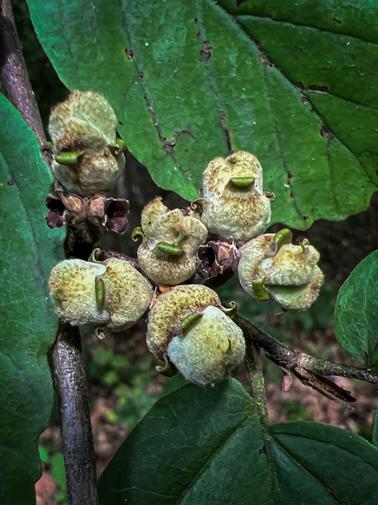 Witch hazel flower buds have been resting since they formed during the previous growing season. Once the leaves are off they bloom and attract pollinators like winter moths and the few hardy flies that remain active into early winter.