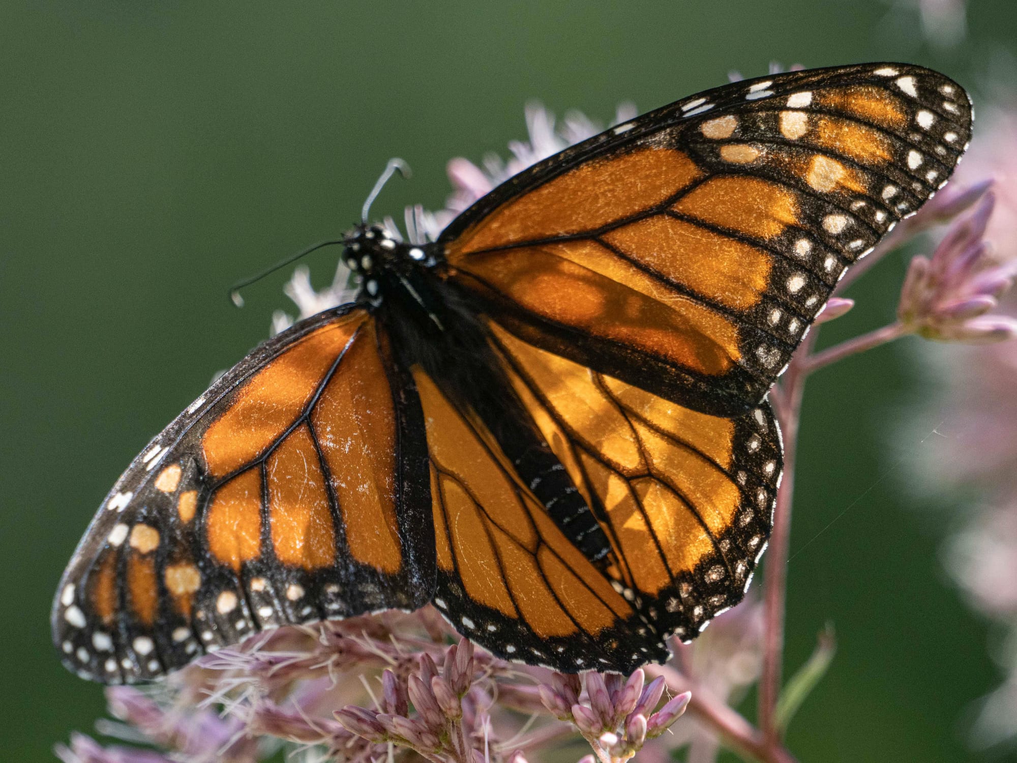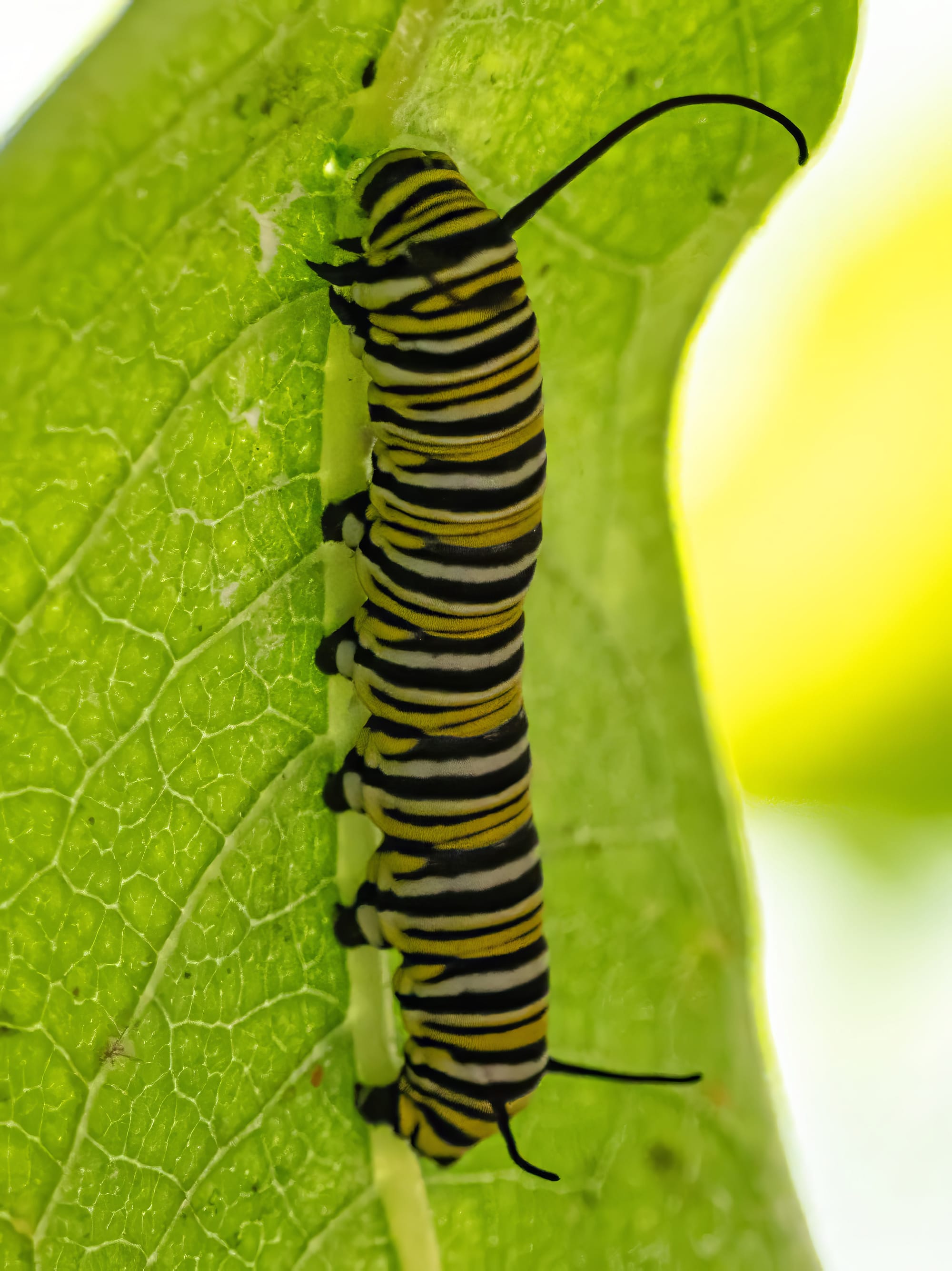 After they hatch from eggs Monarch caterpillars molt five times over 20-30 days as they grow towards metamorphosis. The milkweed plant is essential to their development, you will find Monarch caterpillars on the milkweed plants around the pond.