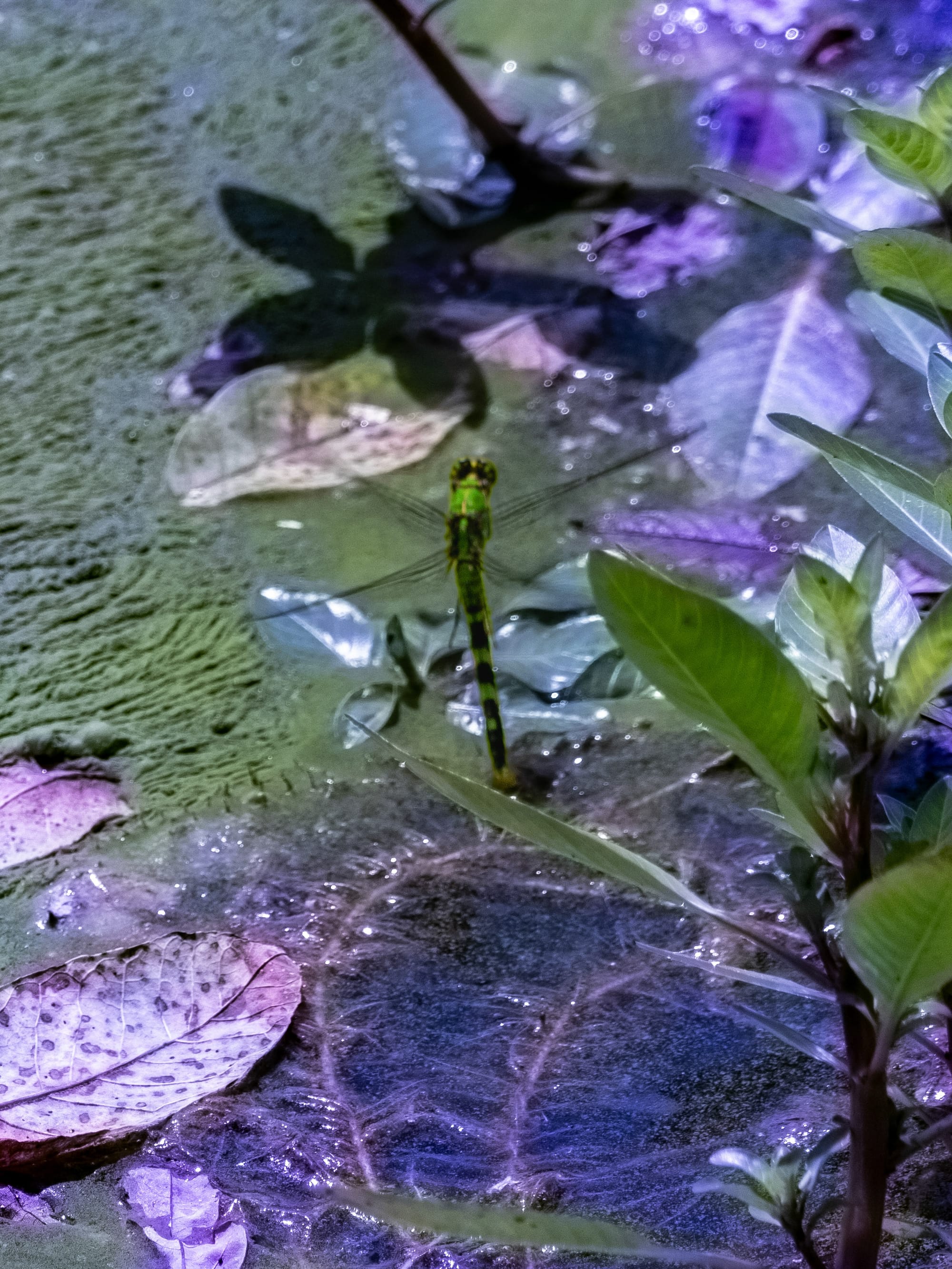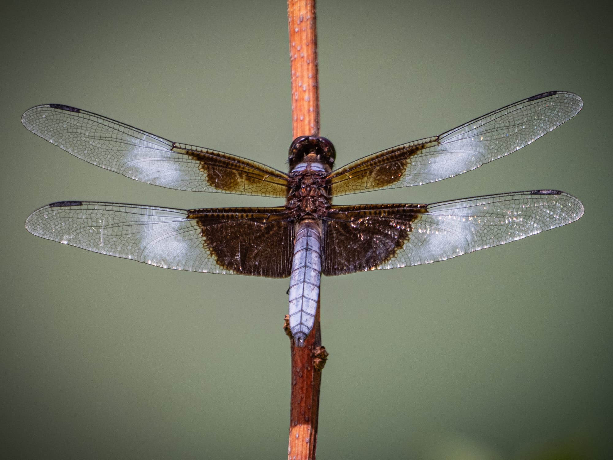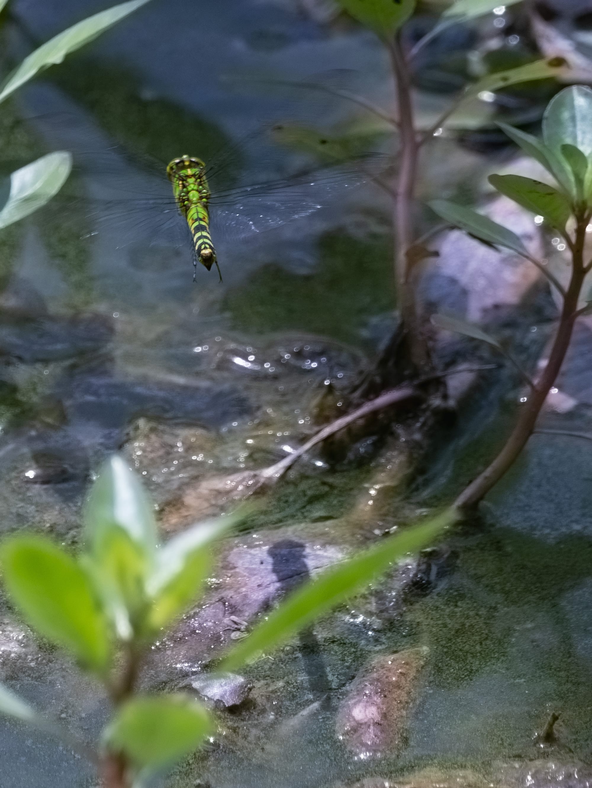 This week's dragonflies; Widow Skimmer, Halloween Pennant, A female Eastern Pondhawk depositing eggs (ovipositing) by hovering over the pond (first photo) and dipping the tip of her abdomen in the water (second photo).