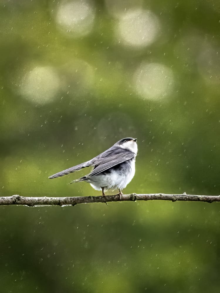 Two pictures of the same species; why does one look so gray while the other such a bright blue? The blue we see in birds caused by the reflection of light off the microscopic structure of their feathers, not because there's a blue pigment present. The rainy-day picture does not have much sunshine, so the feathers look very gray rather than the blue we perceive in brighter conditions.