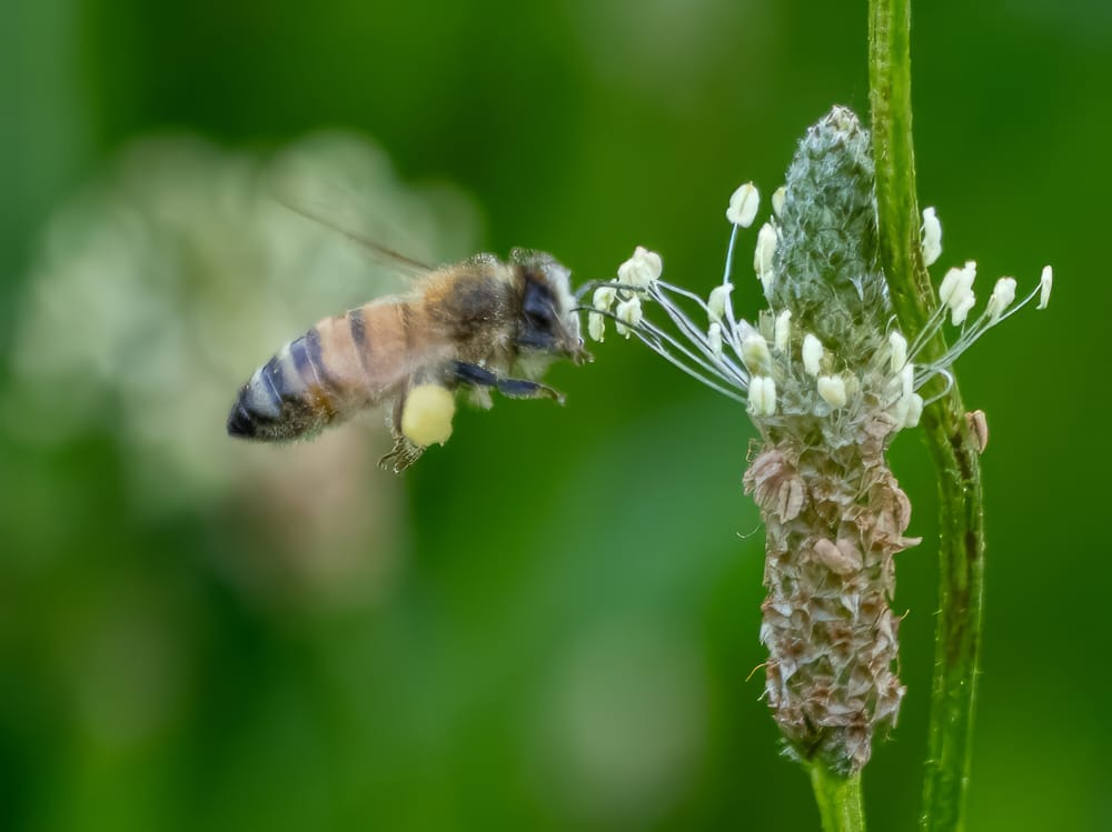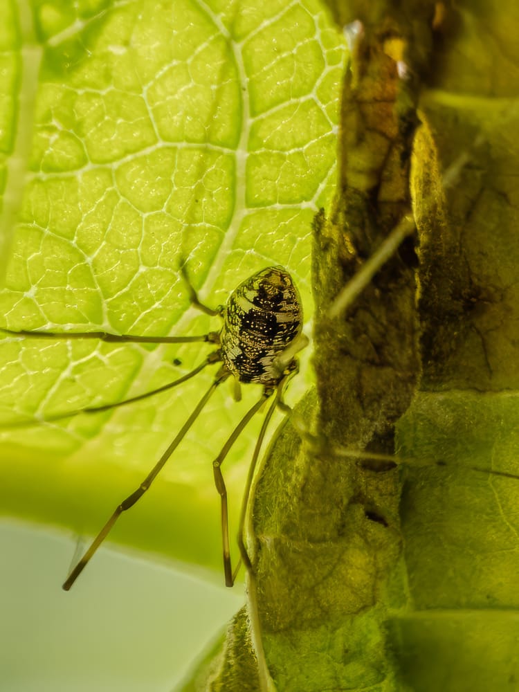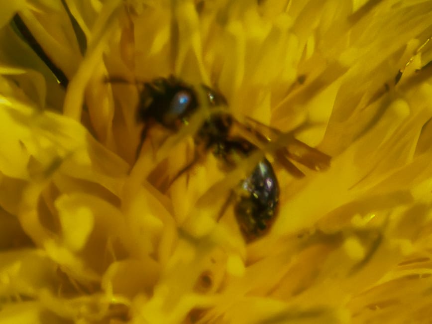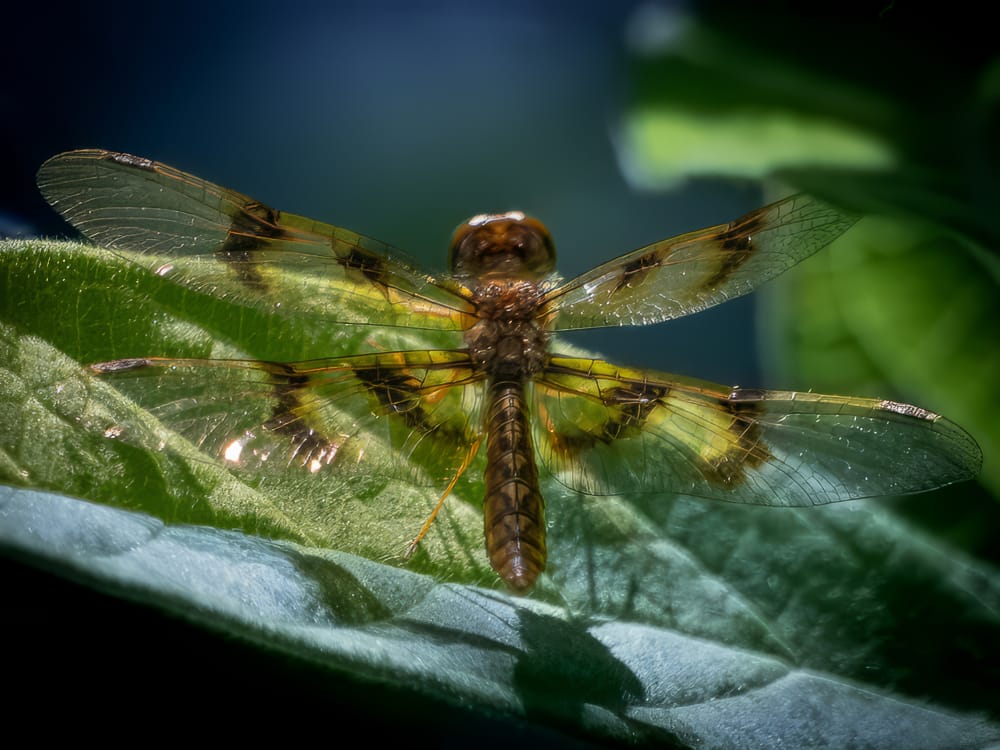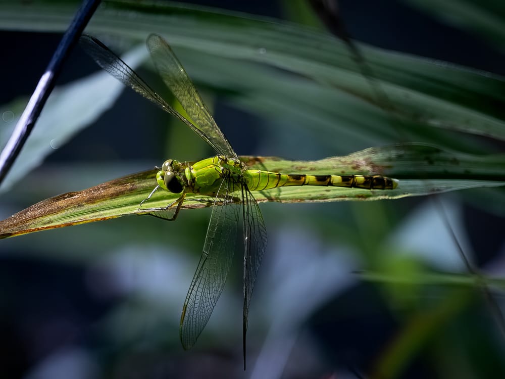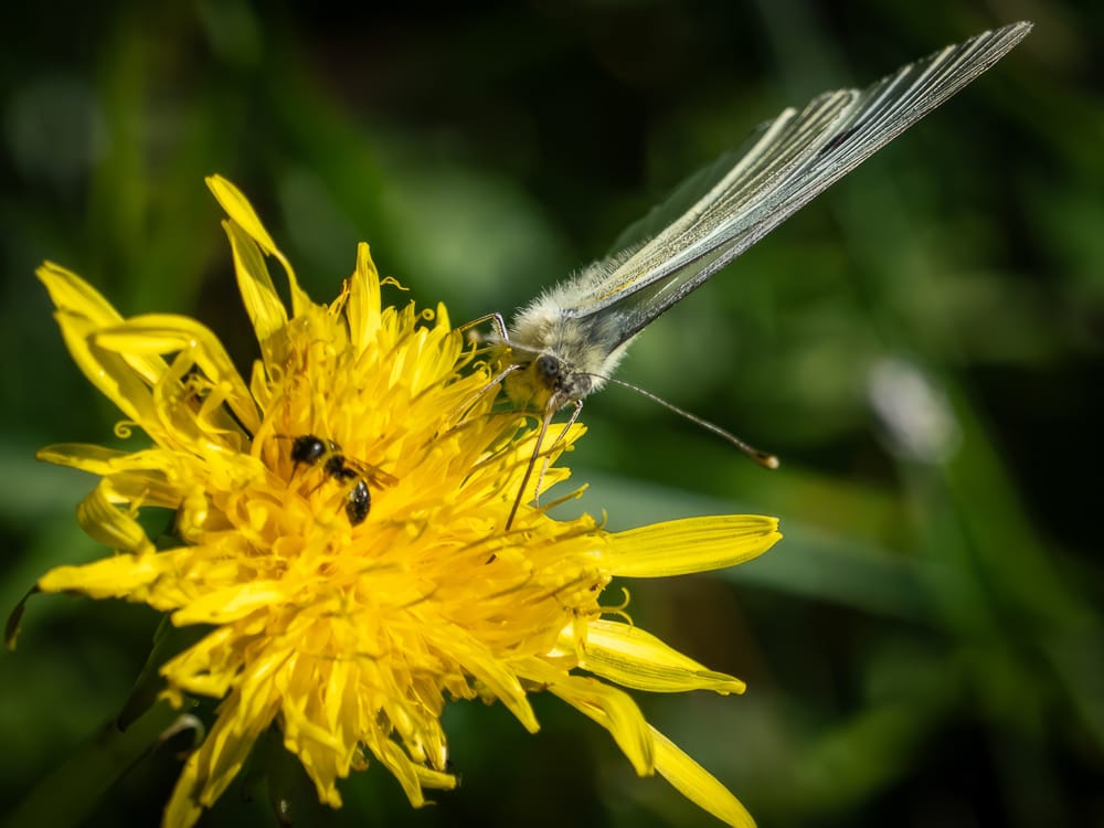Eastern Pondhawk Dragonfly, Cabbage White butterfly dwarfing a very tiny carpenter bee, Eastern Amberwing Dragonfly, Eastern Harvestman (also known as daddy longlegs), Western Honey Bee.