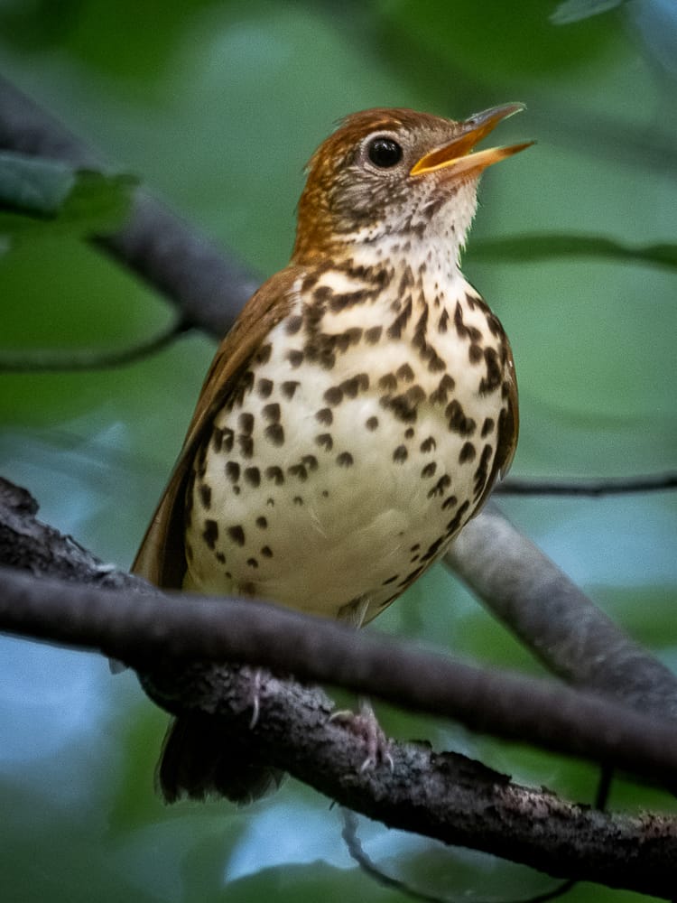I like to walk slowly through the beech grove when the weather is hot (truth be told I walk slowly everywhere when the weather is hot). The canopy of trees shades the trail almost completely, and the undergrowth is lush, cool and green. A walk there is certain to be accompanied by the clear, flutelike song of the Wood Thrush, often from a hidden perch just feet away from where I stand.