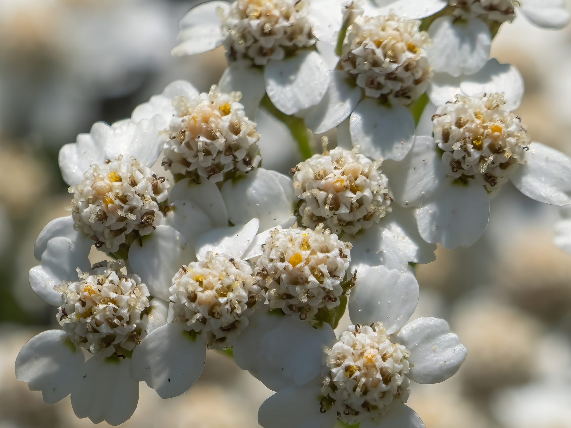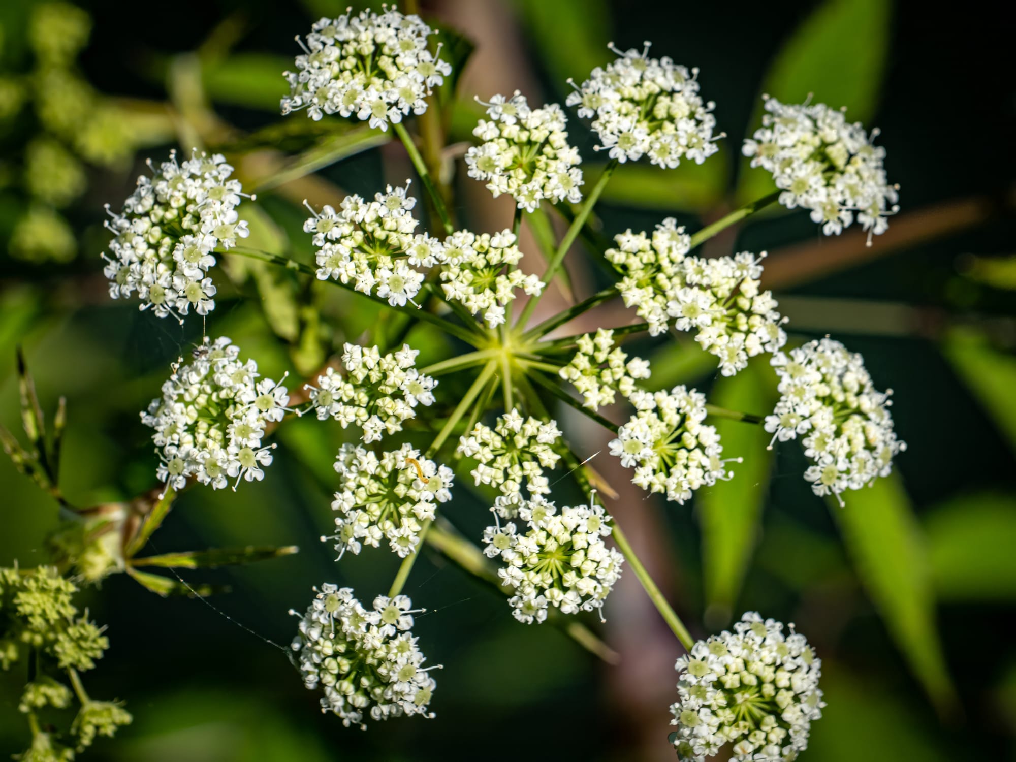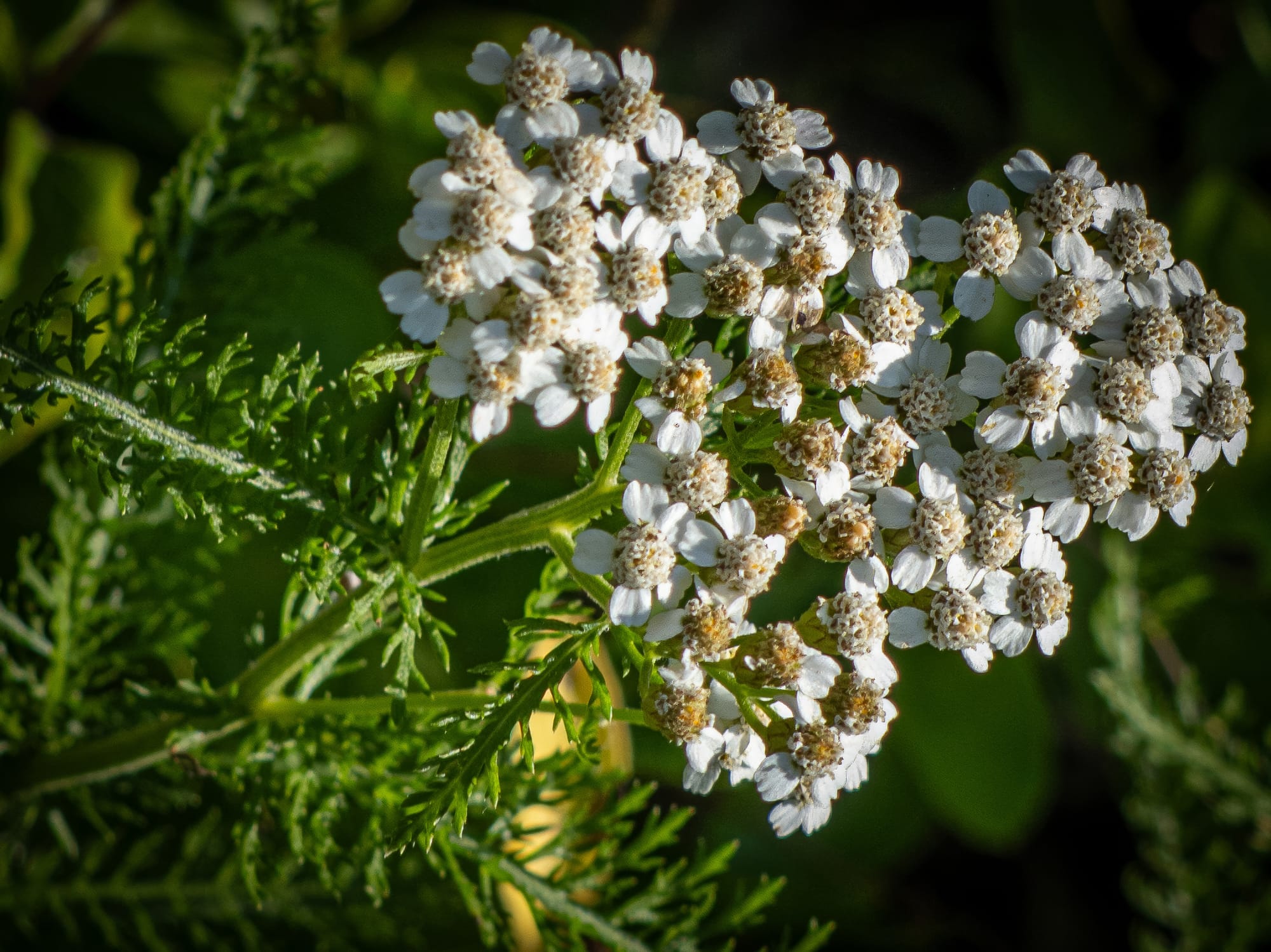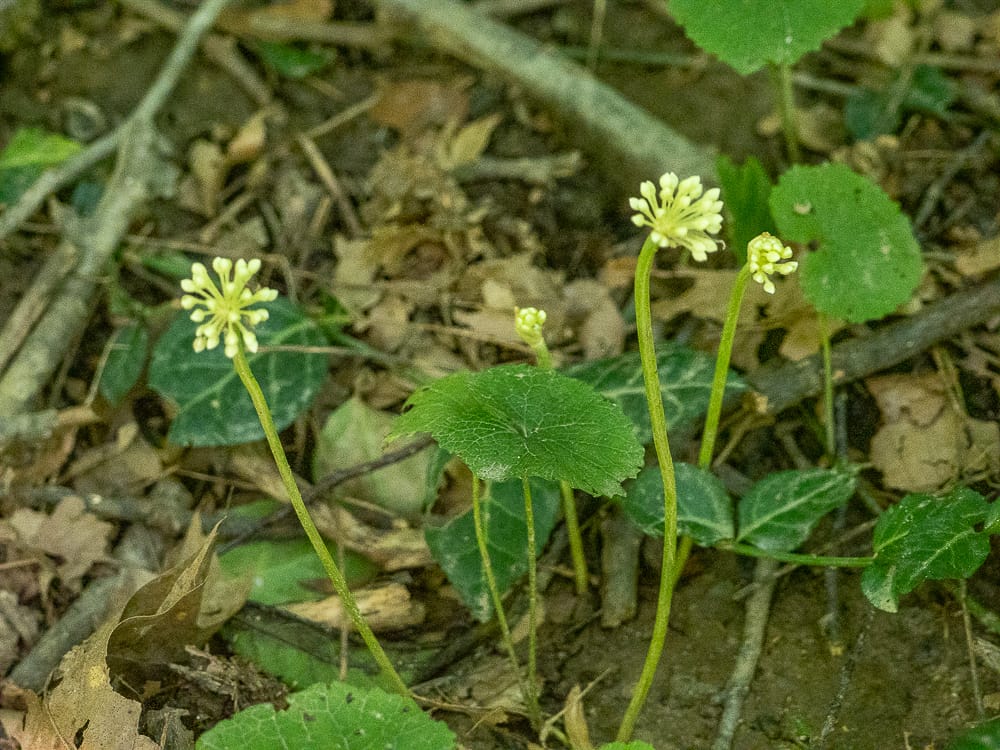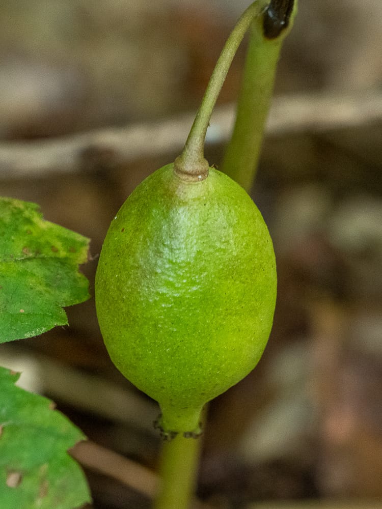 Mayapple progress; many have been browsed already, some are still getting bigger. Umbrella Magnolia seed pod developing. Ramps(or wild leeks) are now flowering, Chicory, Common Yarrow and close-up of common yarrow flowers, Water Hemlock, Broad-leafed Cattail