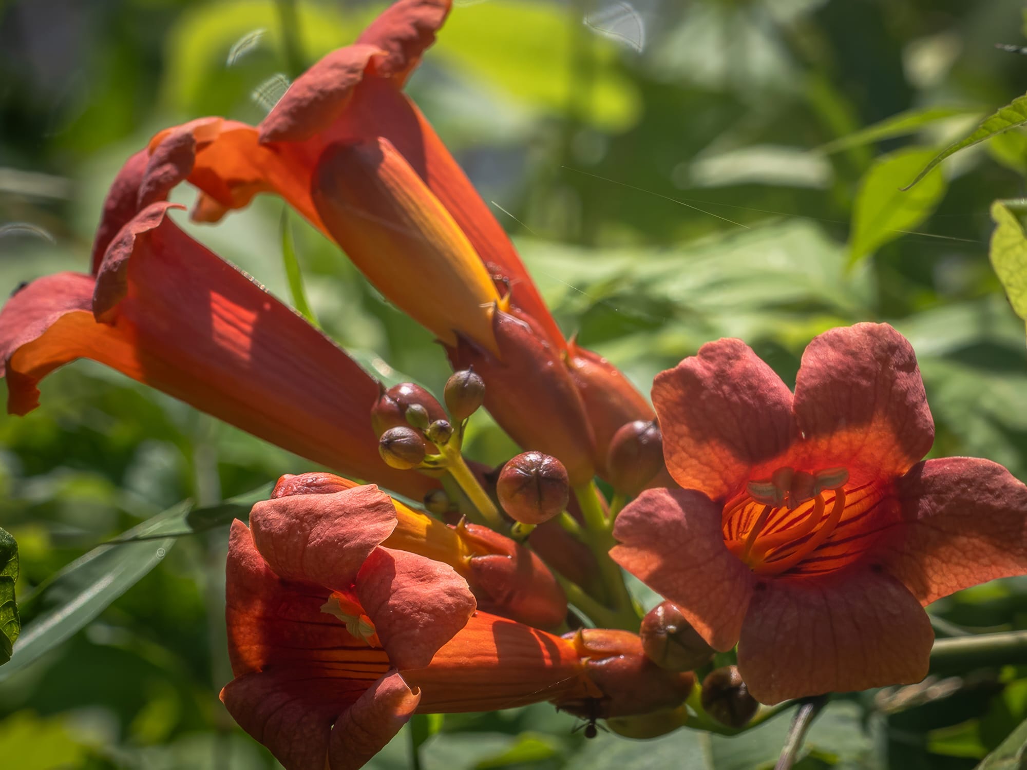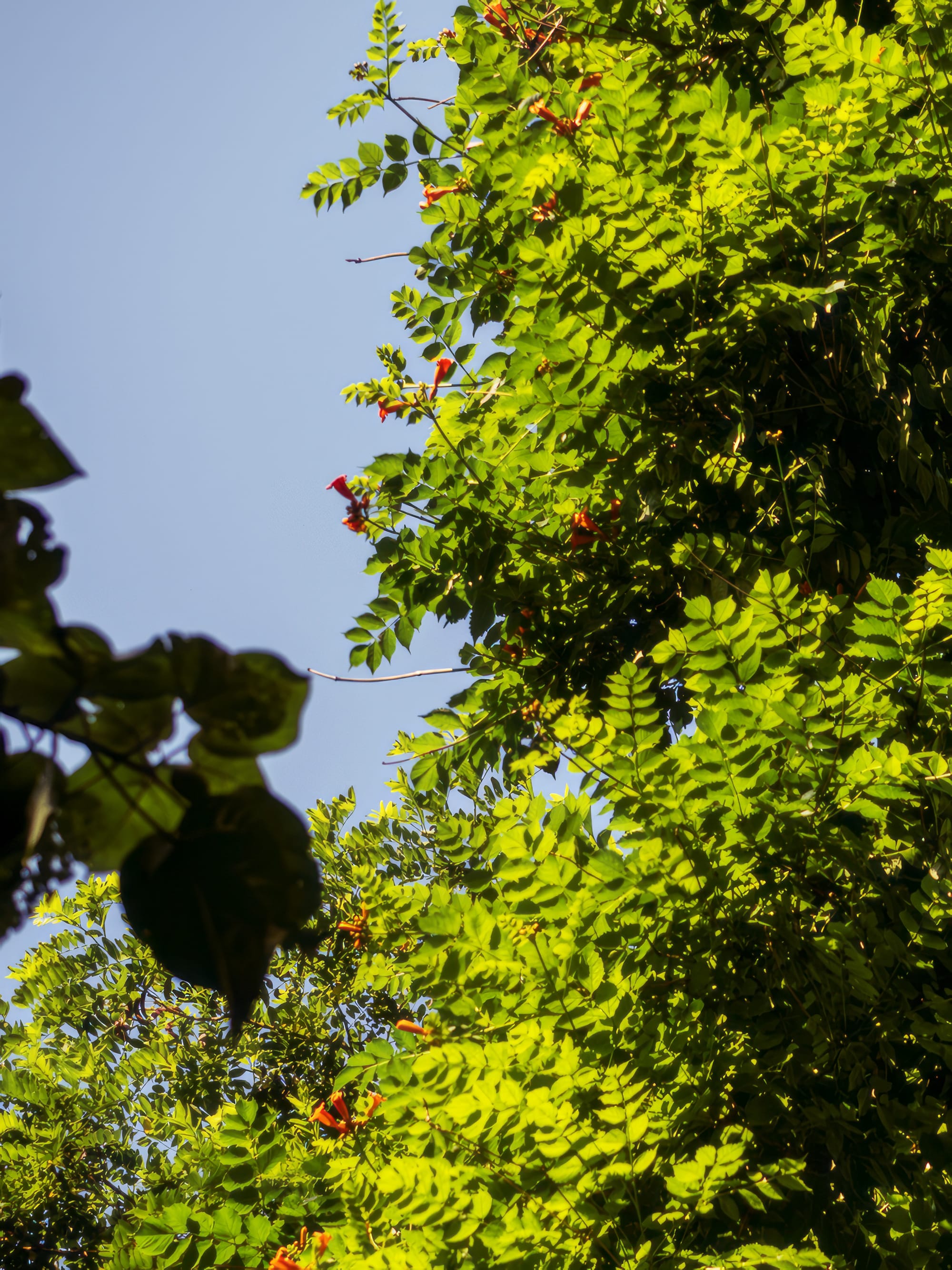 The massive 60' tall Trumpet Vine is flowering too.