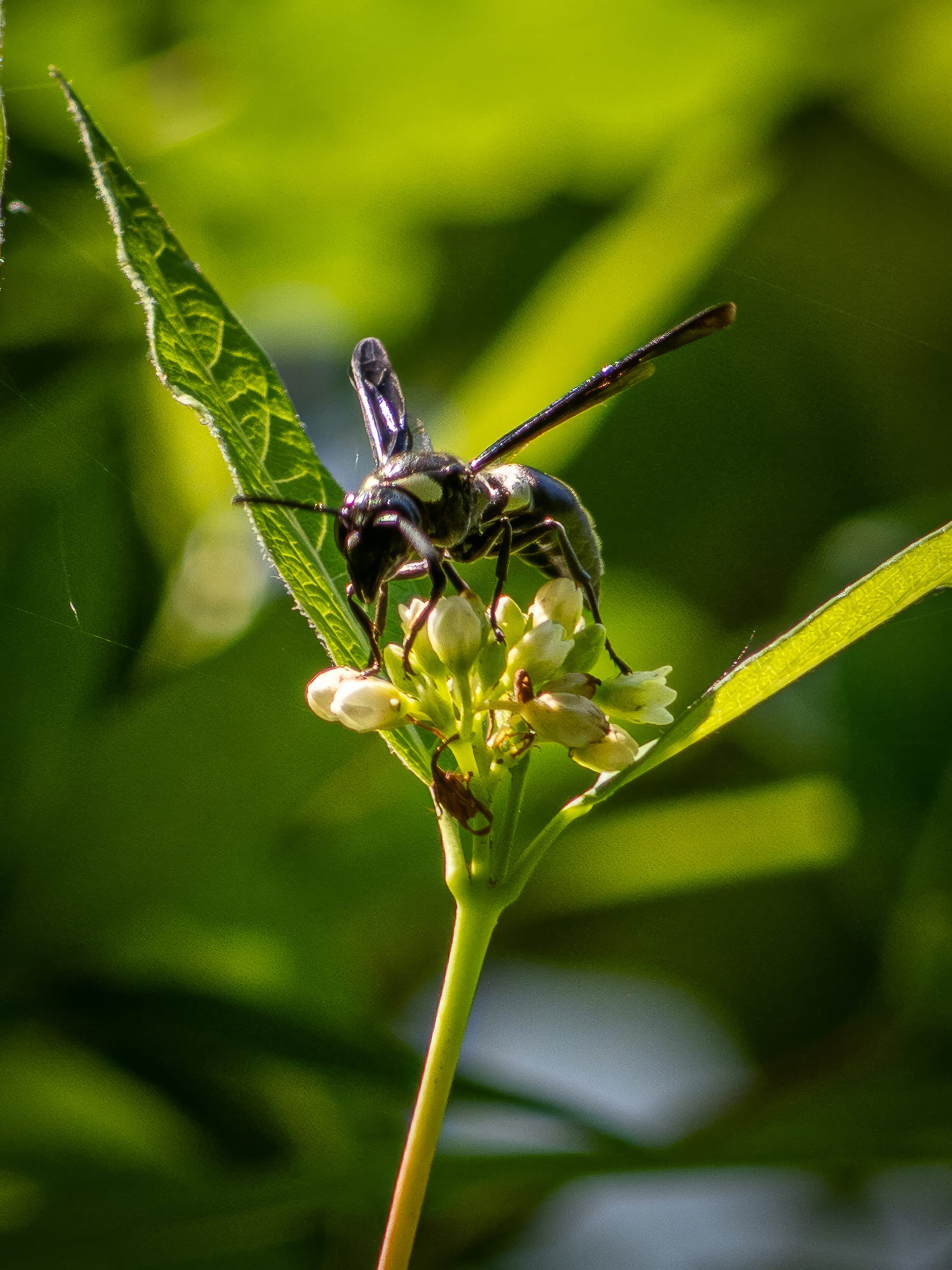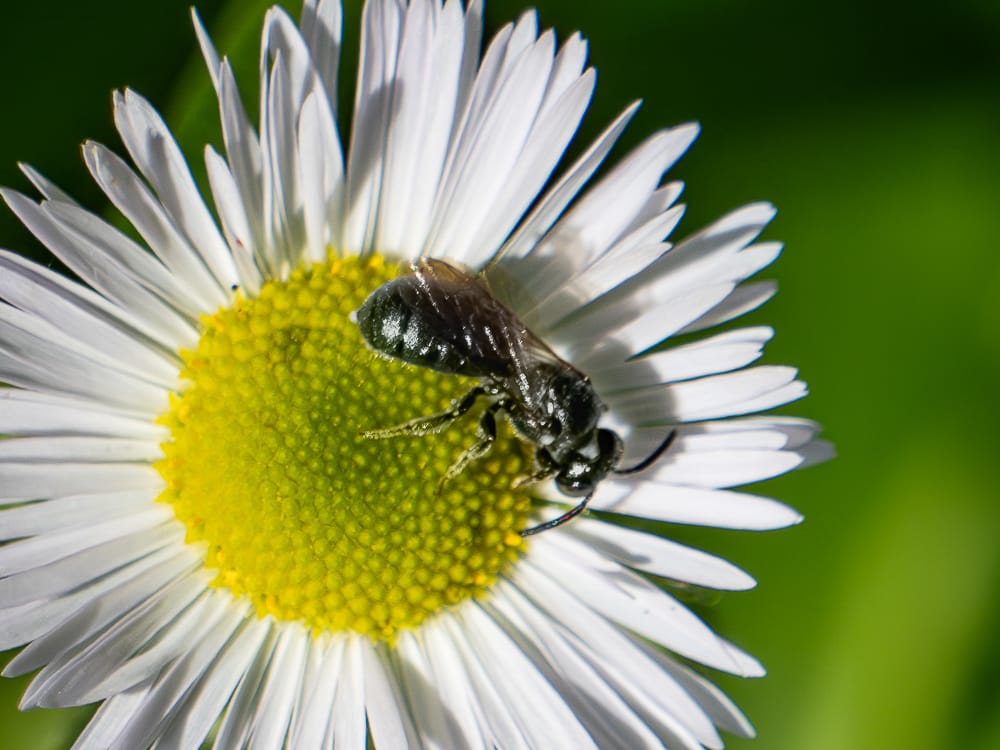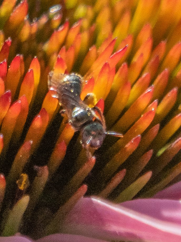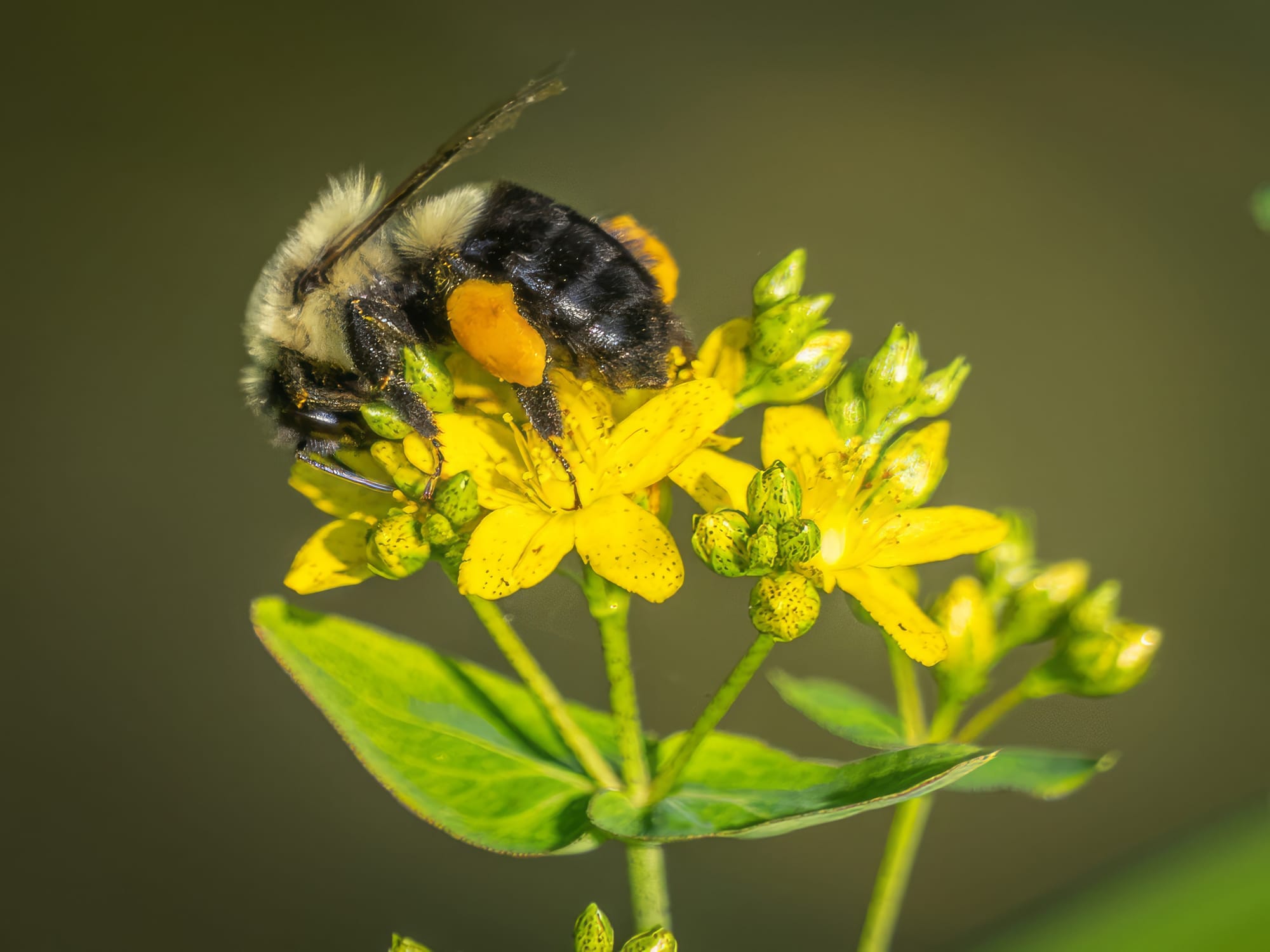 Eastern Bumble Bee on Spotted St. John's Wort, Four-toothed Mason Wasp, Two tiny Carpenter Bees.