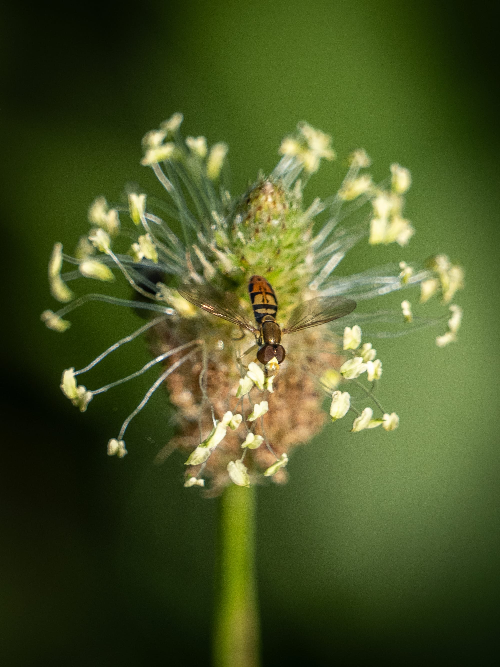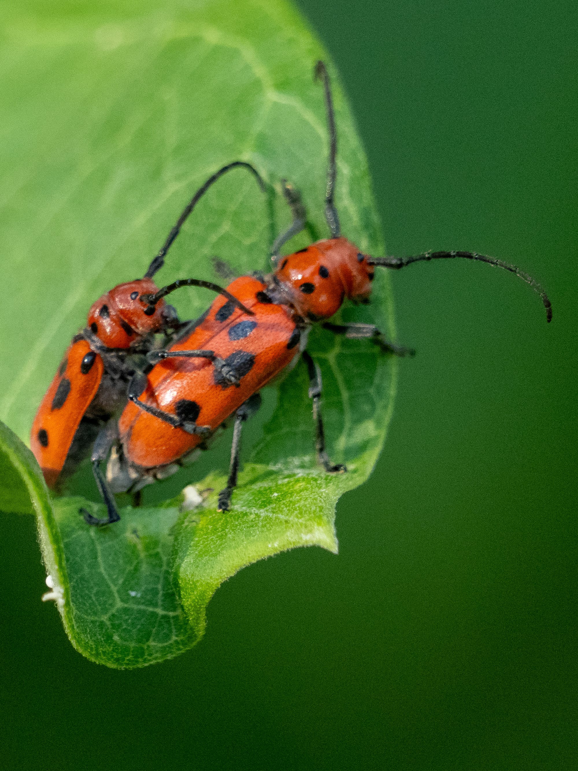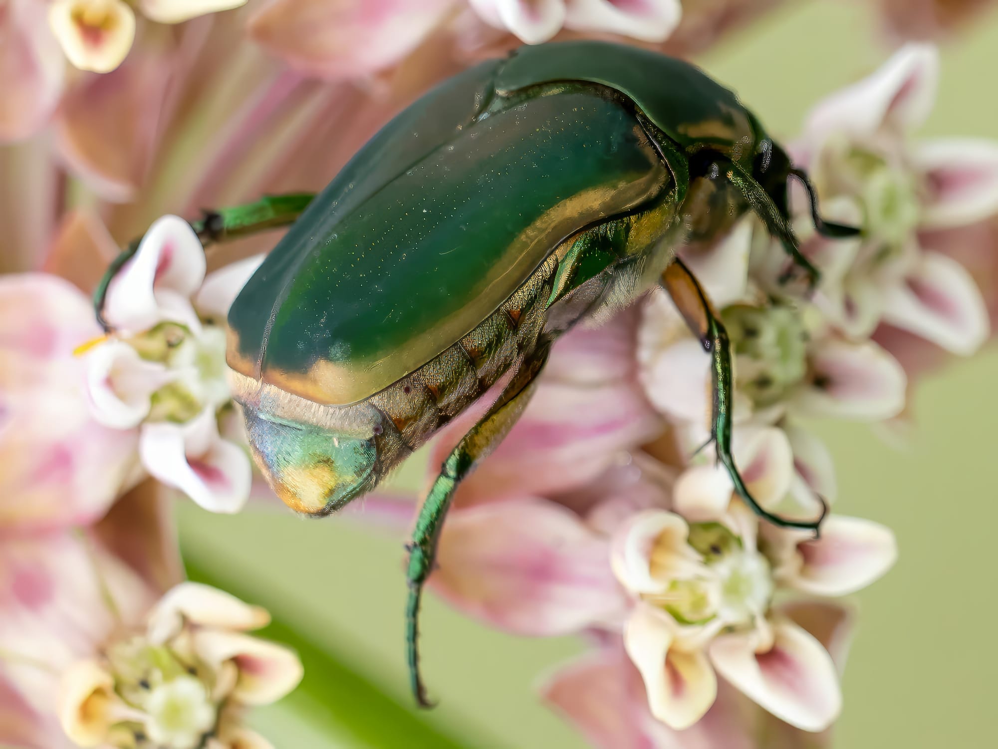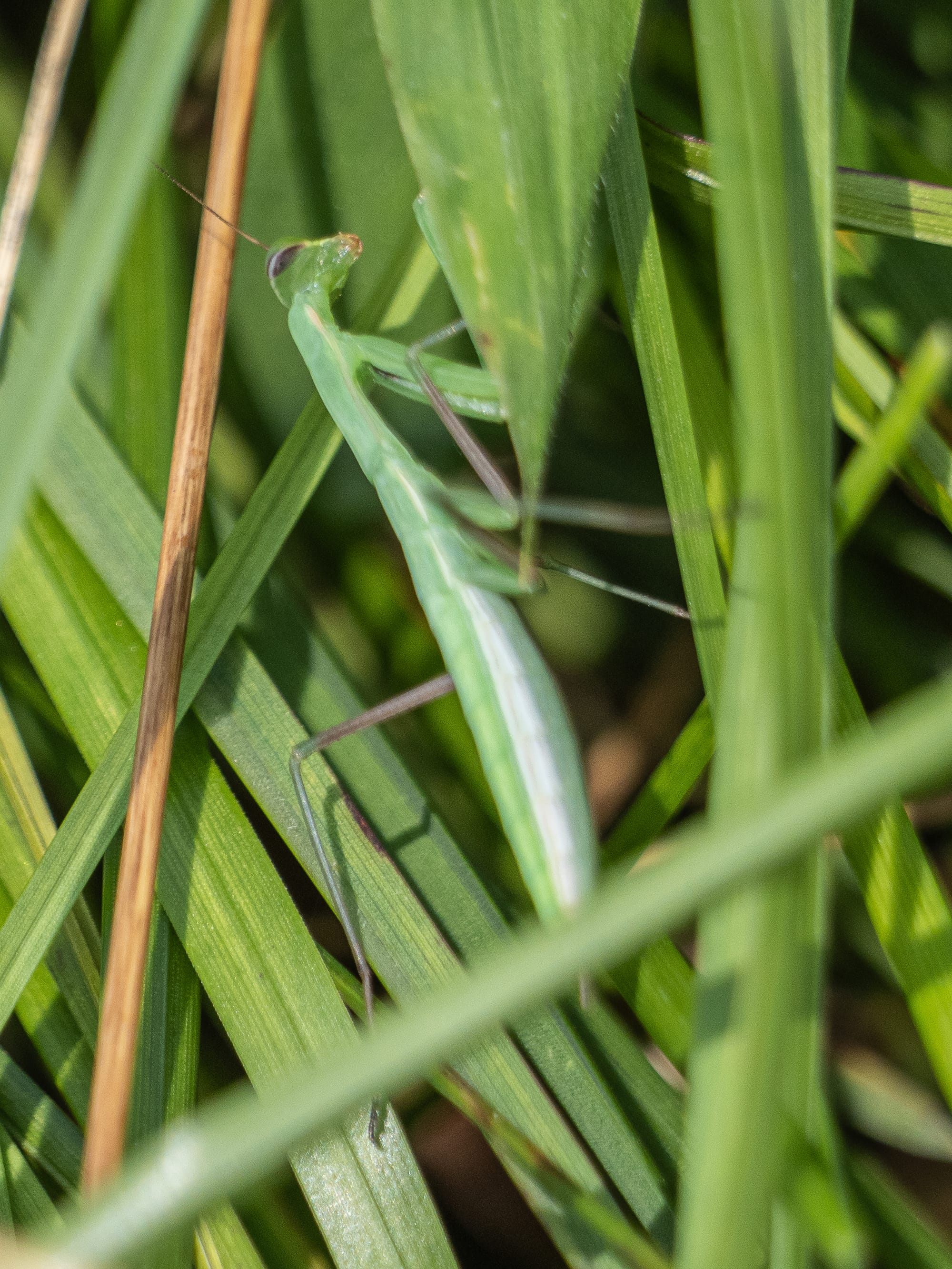 Calligrapher Fly, Red Milkweed Beetle, a well-hidden Carolina Grasshopper, European Mantis, Common Green June Beetle (the June-bug of cuteness fame)