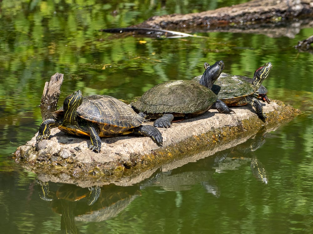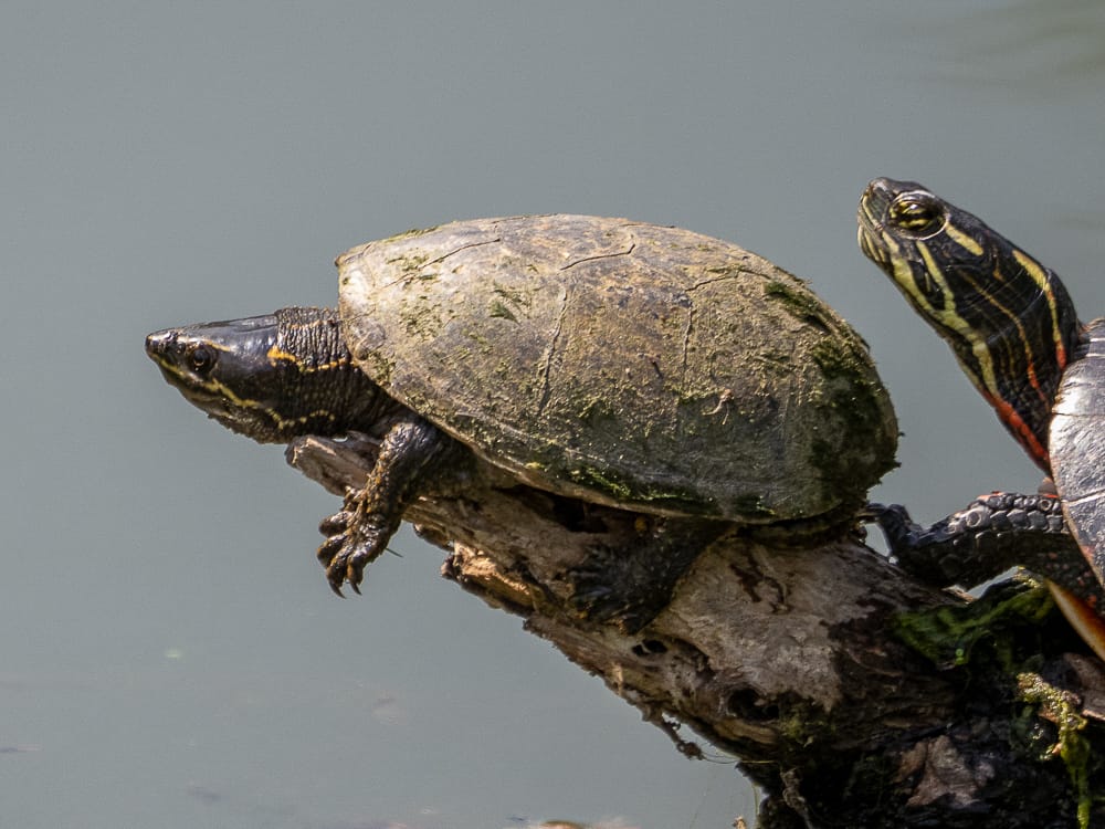 Eastern Musk Turtle and Painted Turtle, a large Red-eared Slider, Three Red-eared Sliders, Snapping Turtle