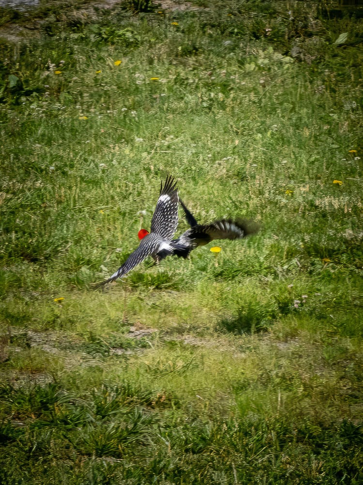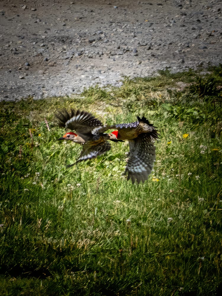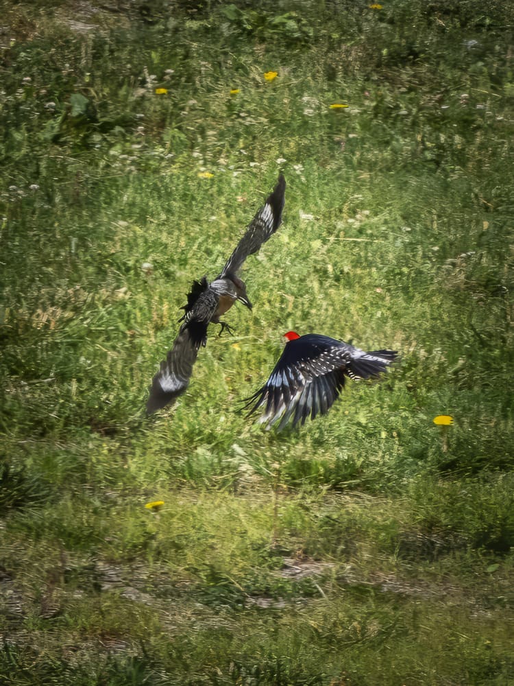 Two male Red-Bellied Woodpeckers sorting out territorial differences (female Red-bellied woodpeckers have only a red nape, males have a red nape and crown.) Once the tussle was over one flew off to hammer on a rain gutter (makes a very impressive sound) one reason woodpecker's hammer is to assert their territory.