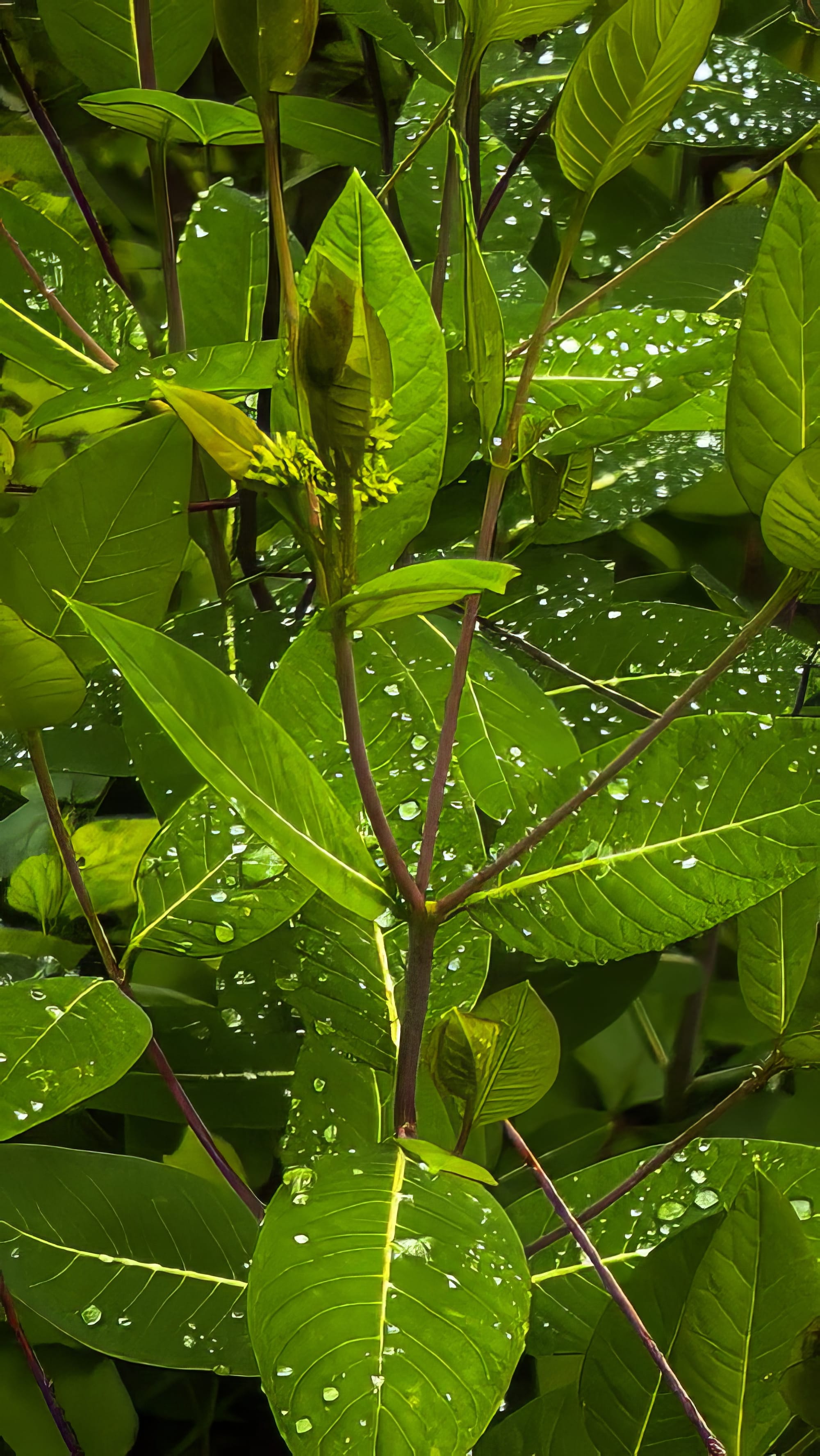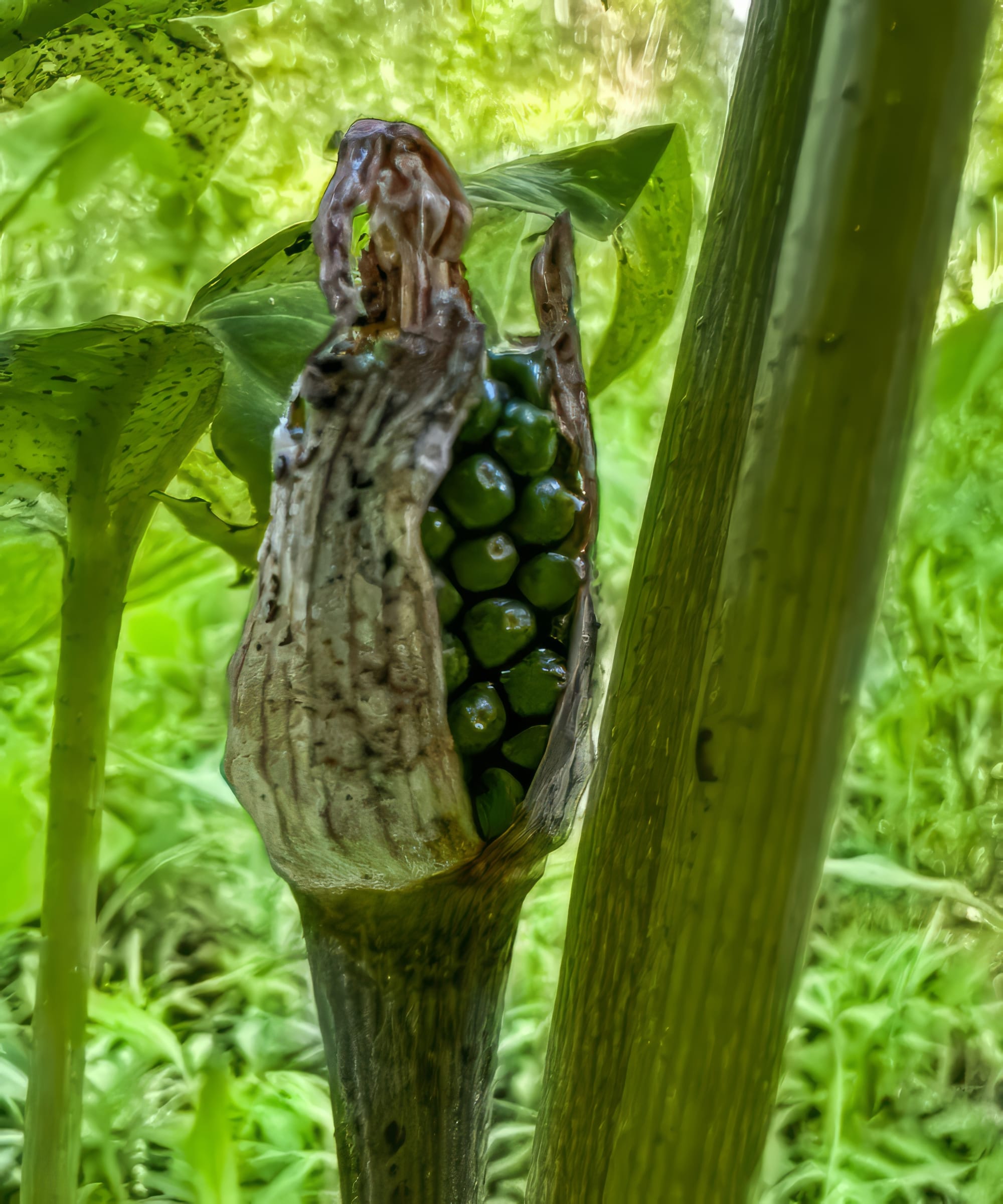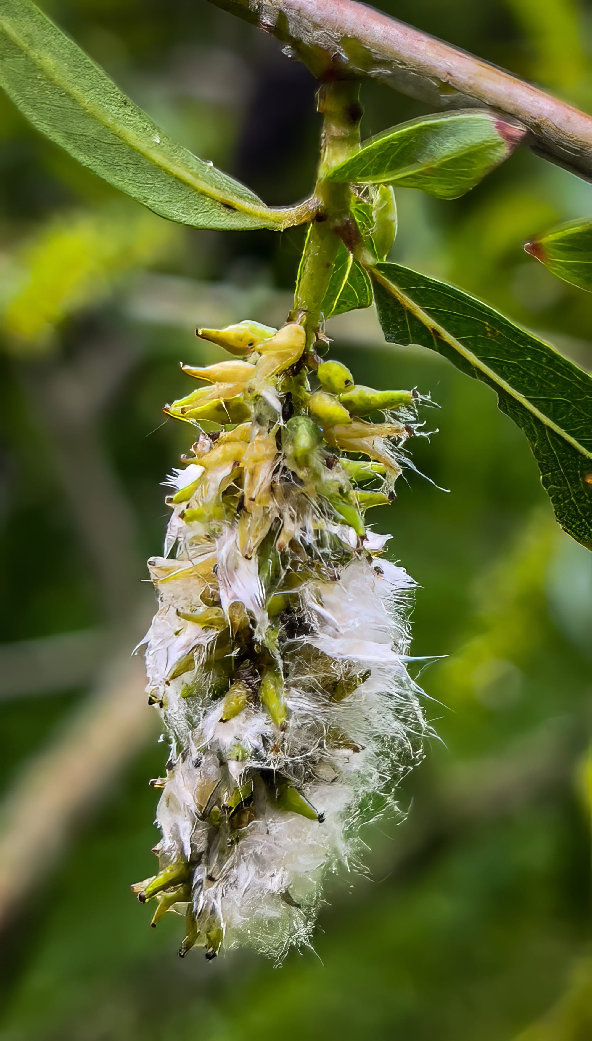 Rain beading off the leaves of Hemp Dogbane, Black Willow catkin ready to release seeds into the air, Jack-in-the-pulpit spadix with seeds, Fruit developing on catkin of American Hornbeam