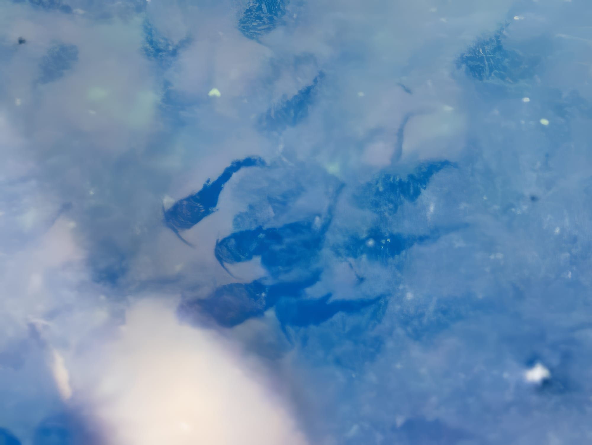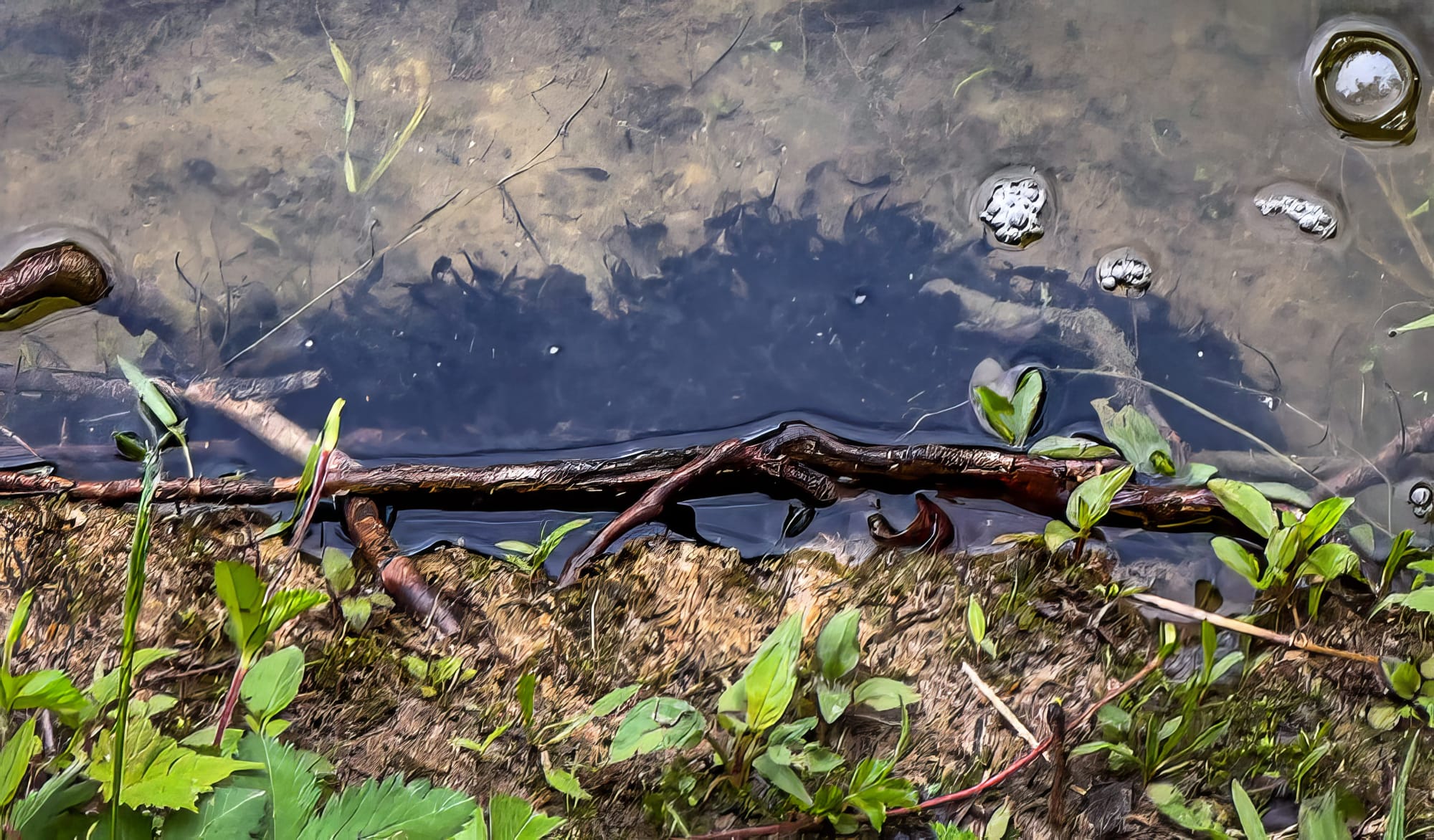 I saw what I thought were tadpoles along the bank of the small pond. I looped back to look and was surprised to see them huddling around a Brown bullhead catfish. When I was able to get a closer look at the picture I saw the whiskers on the young fish. I learned that catfish keep their young close for around a month after they have left the nest. The last picture is of hatchling Largemouth Bass (corrected from my mistaking them for Mosquitofish in the original post).