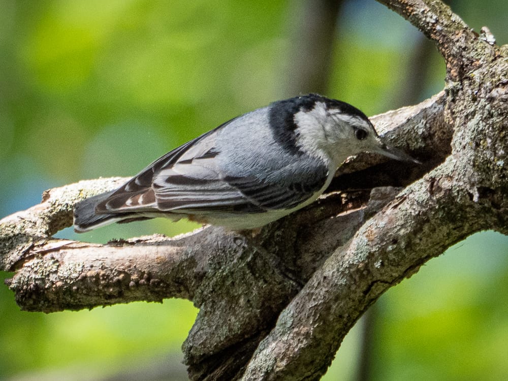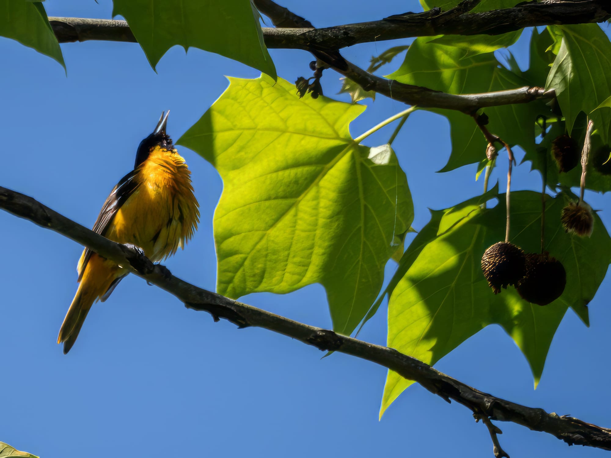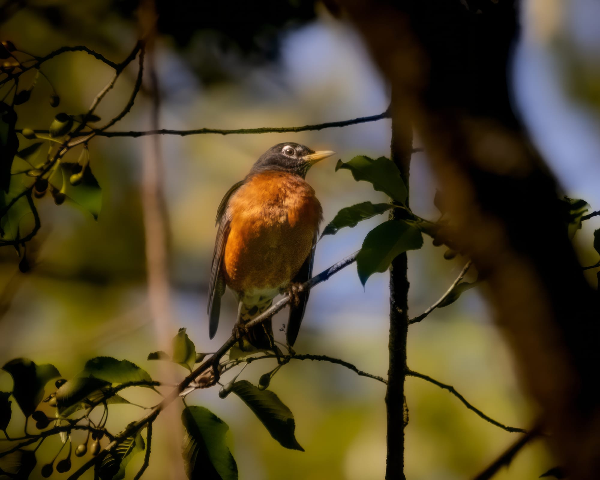 Robin nestlings peeking out of the nest, A blurry (man they are fast!) picture of a swooping Barn Swallow, a rather proud looking Robin, Inquisitive Nuthatch, one day in the far distance a Crow (top) harassing a Red-tailed Hawk. an exultant Oriole, shady Carolina Wren.