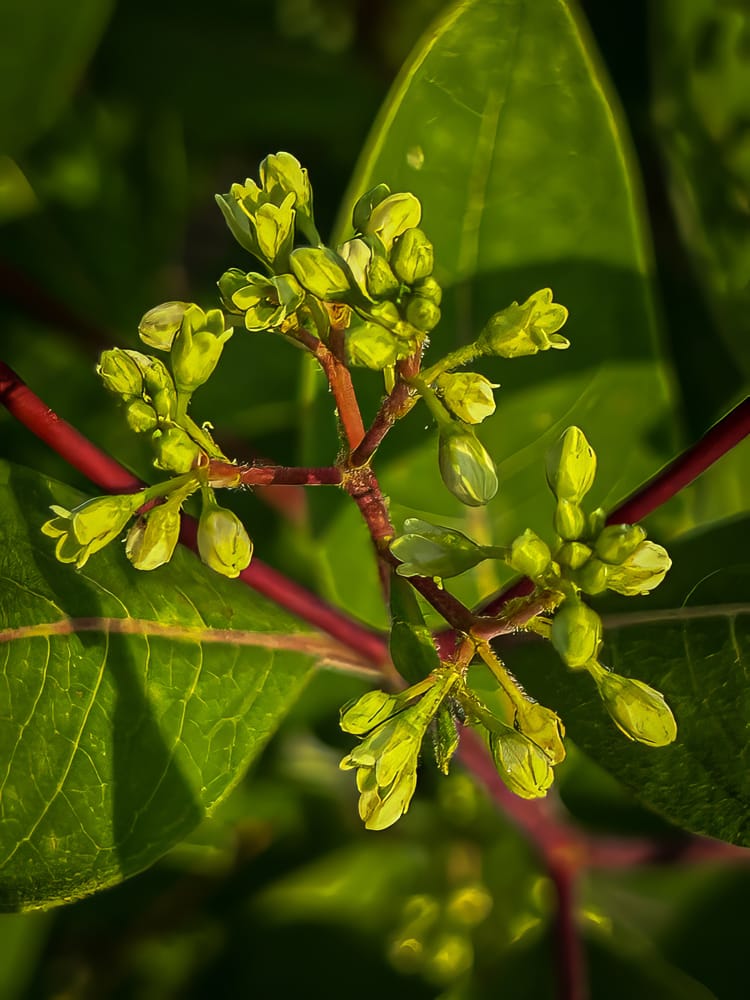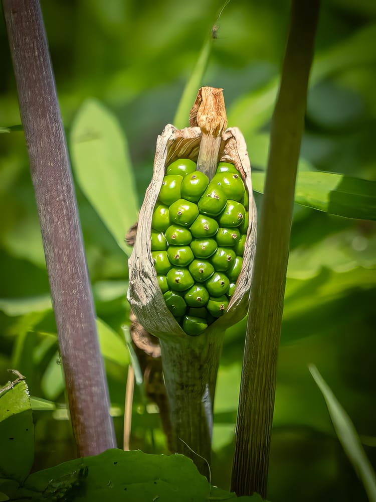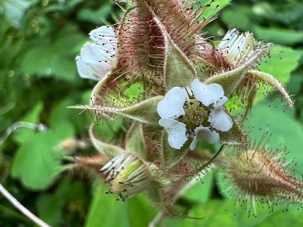 Mayapples maturing (many have already been browsed by deer or other Mayapple aficionados, Jack-in-the-pulpit spadix seeds developing (note the withered spathe), Wineberry flowers, Hemp dogbane, Canadian wild ginger (I have it on good authority this is NOT the ginger in Canada Dry), Swamp White Oak sapling in an old stump.