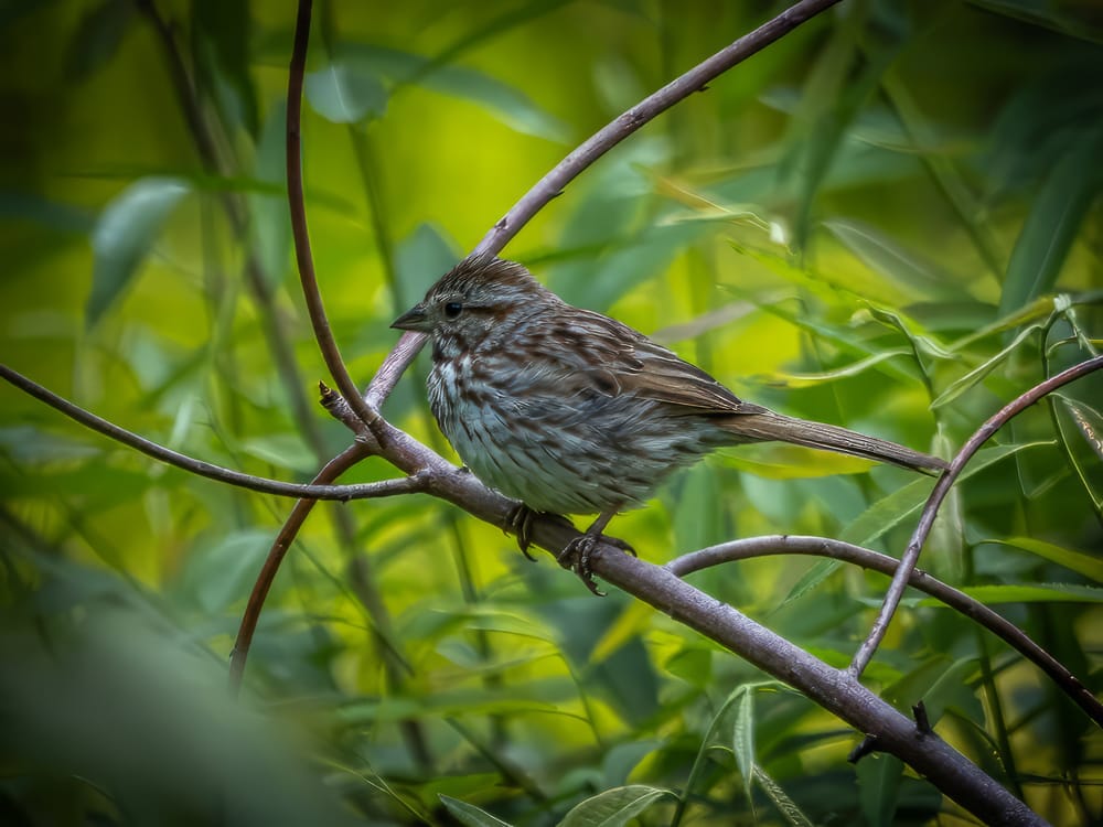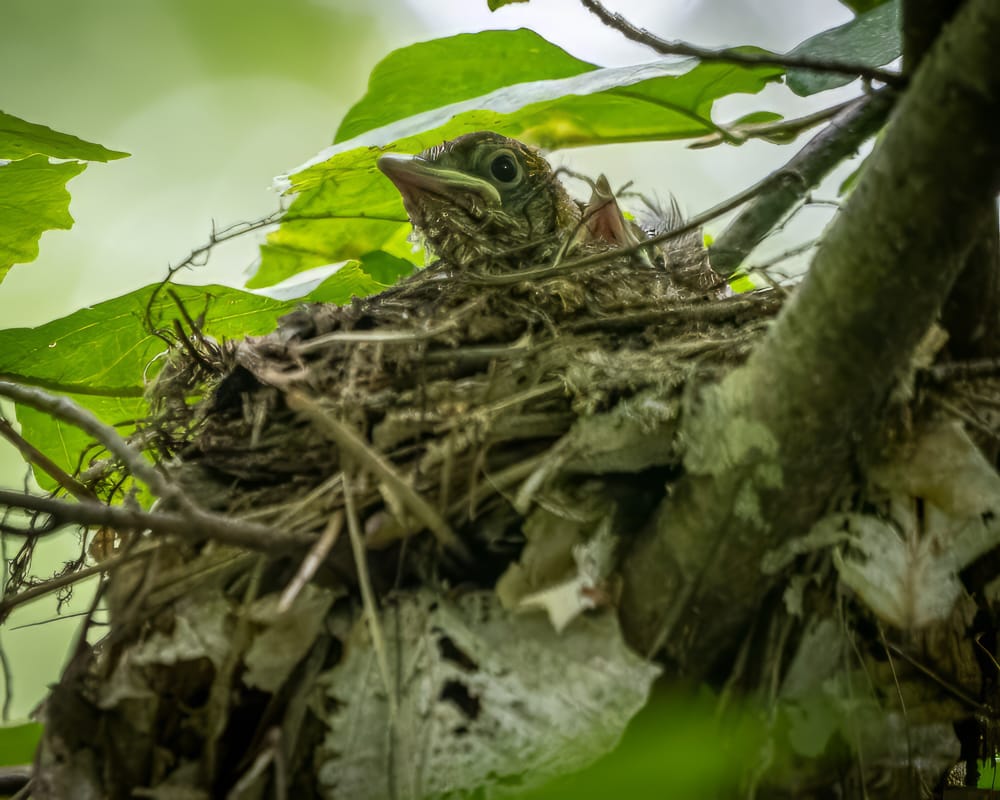 Another look at the Double-Crested Cormorant, A watchful Green Heron, Tree Swallow, Robin, Bluejay, Song Sparrow, and another Song Sparrow!, Chicks in the Wood Thrush nest we first saw last week.