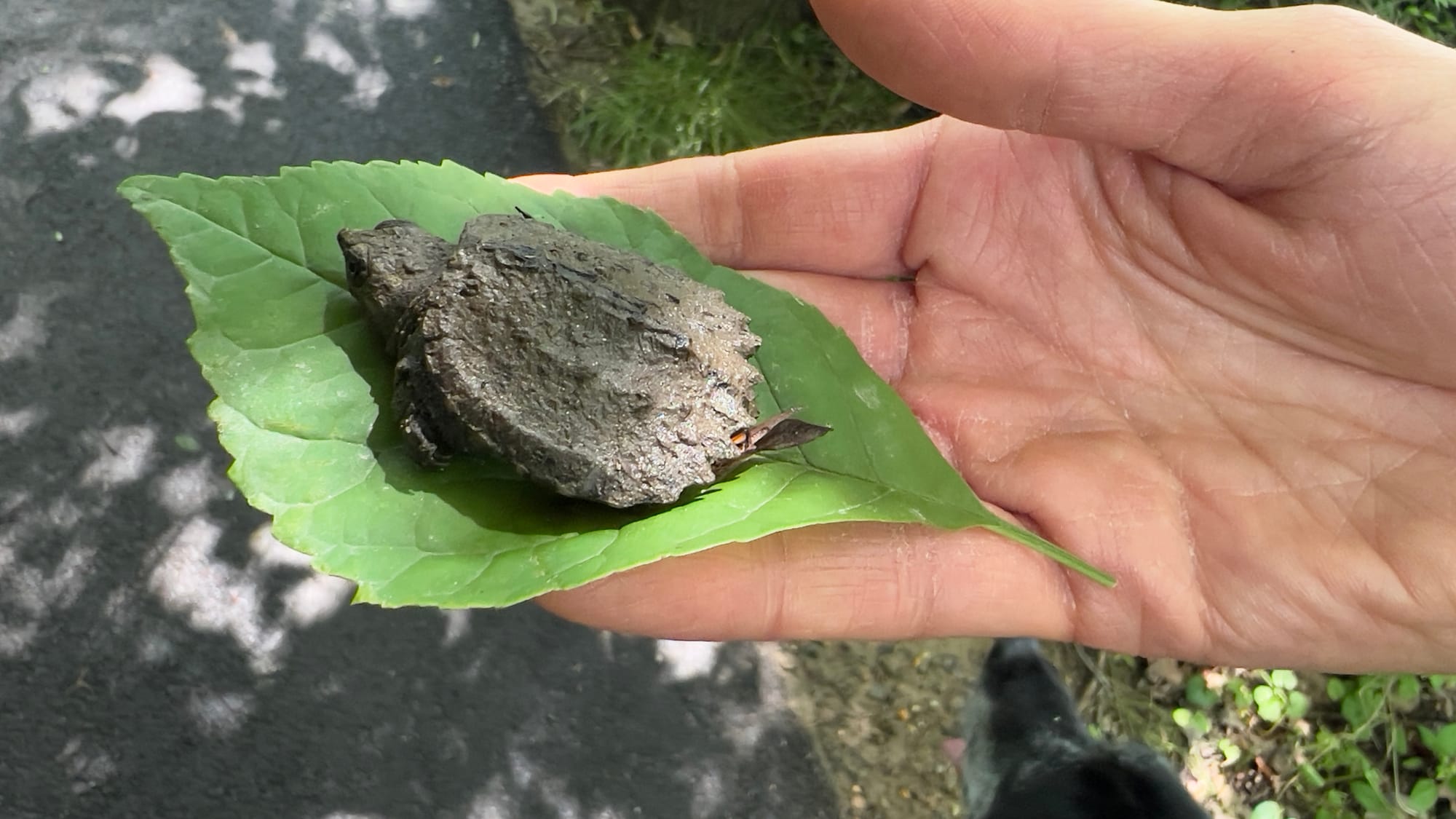 A good samaritan spotted a tiny common snapping turtle in one of the park's paved pathways on it's way to the pond. Fearing it would be stepped on they picked it up, (shielded in a leaf) and wondered exactly what to do next. I advised that they put it down on the edge of the pond, and when I checked back in a few minutes it had gone into the water.