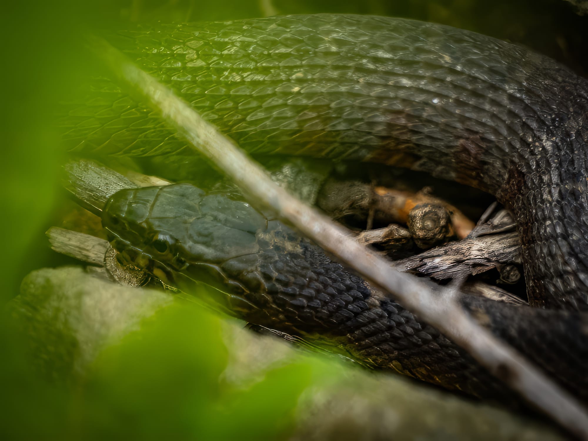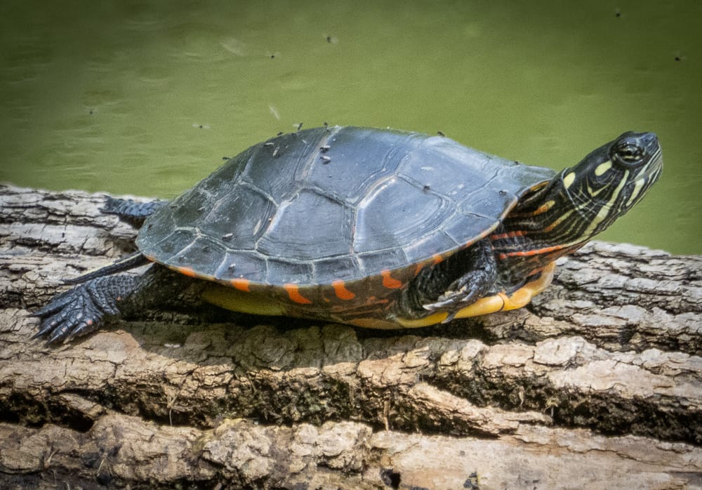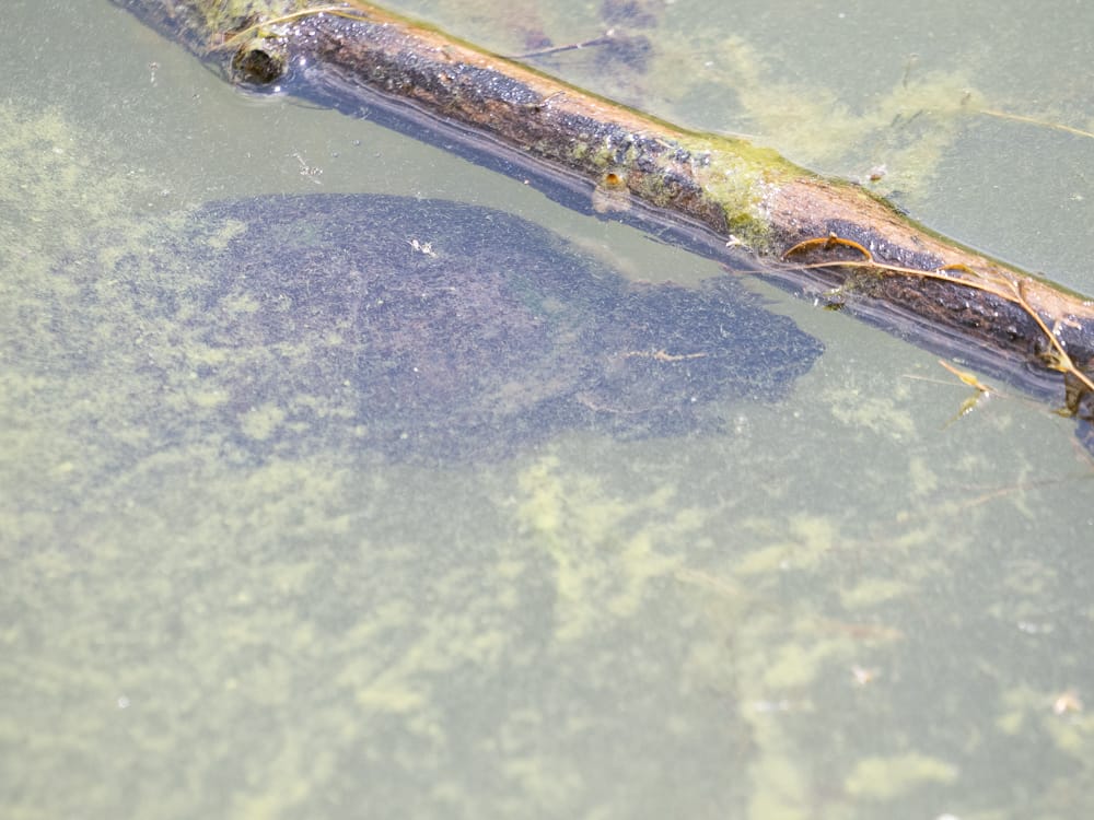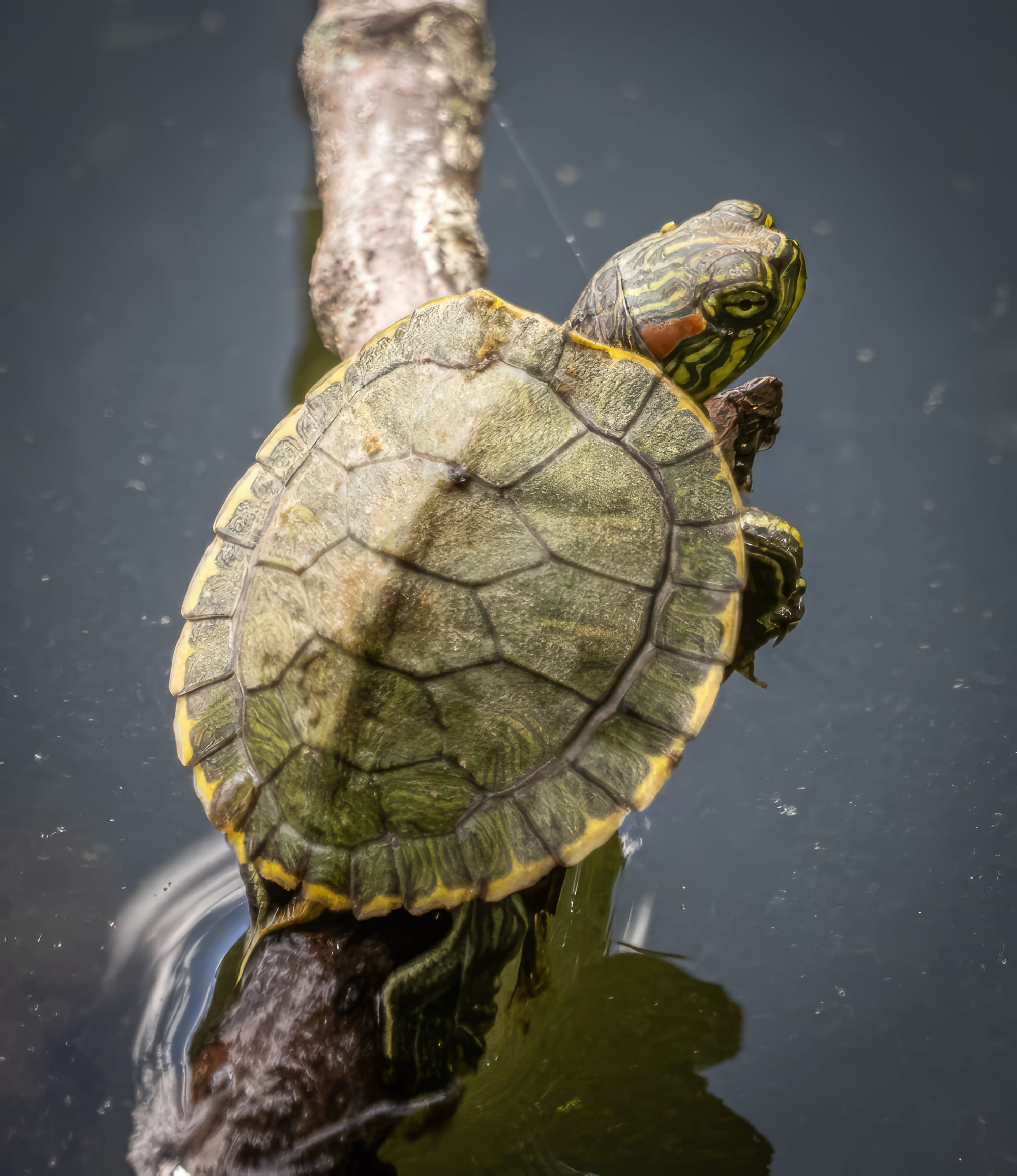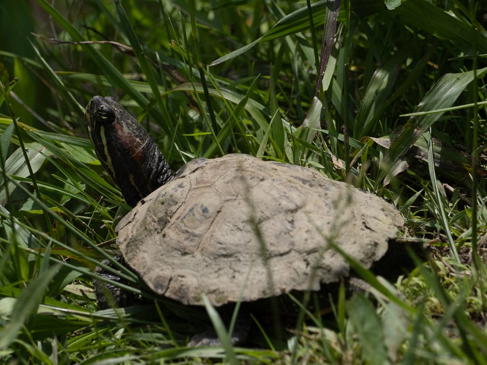 Tiny Red-eared Slider (possible another over-wintered hatchling?), Common Water Snake, Red-Eared slider on the way back to the pond after laying eggs. Eastern Musk Turtle foraging near the edge of the pond, Painted Turtle Basking.