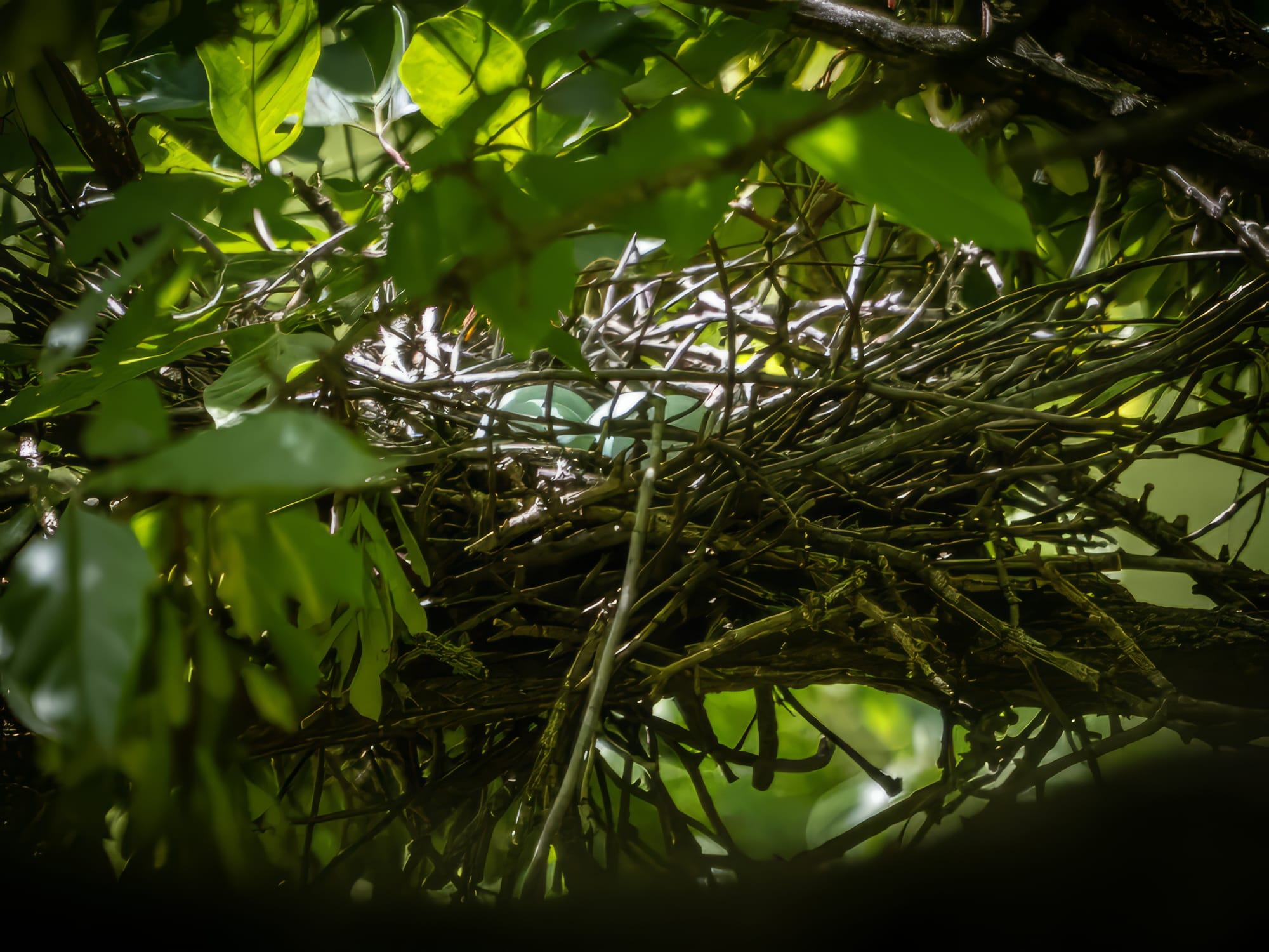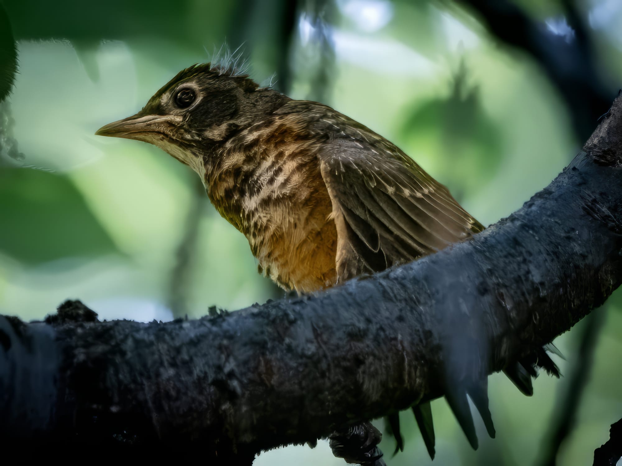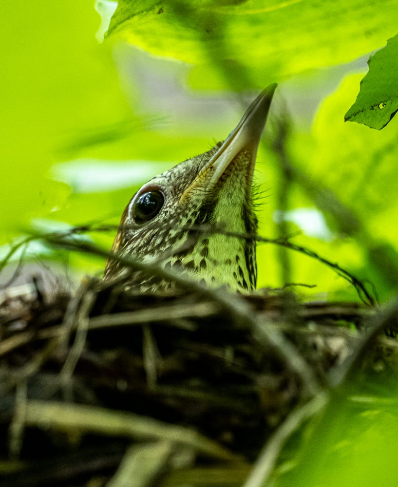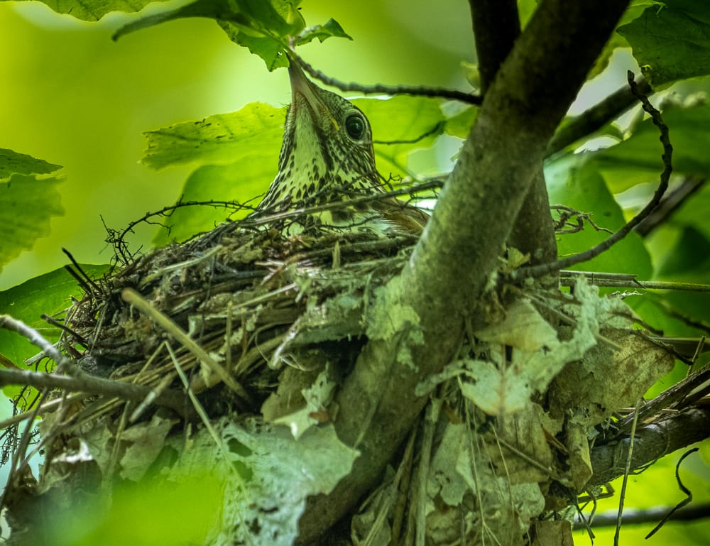 The Green Heron staring back at us from its nest. The second picture taken on a nice sunny day (an excuse to leave the nest unattended for a bit) shows us four eggs. Two pictures of a Wood Thrush on their nest in a Witch Hazel tree, and a Wood Thrush calling. The next two are tree swallows tending their young in one of the nest boxes. Next a fledgling Brown-headed Cowbird - a parasitic nester that lays their eggs in the nest of another species who then incubates them and raises their young. Next a fledgling Robin still holding on to a downy crest.