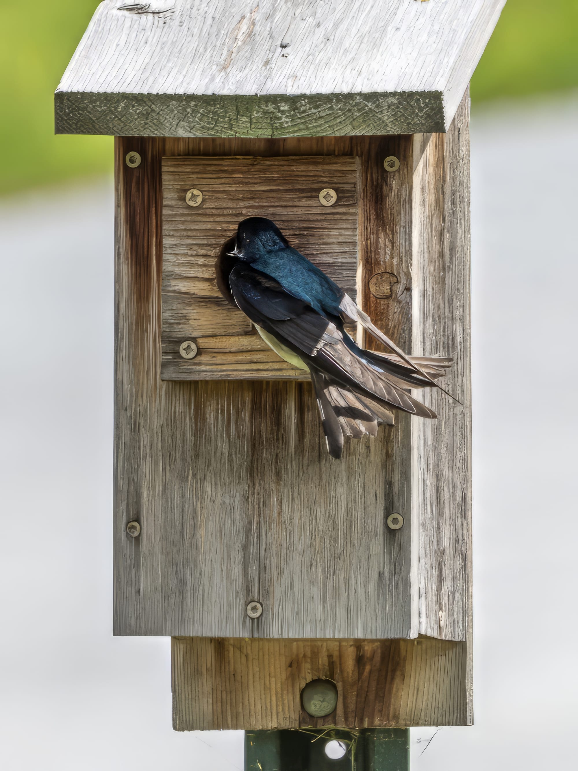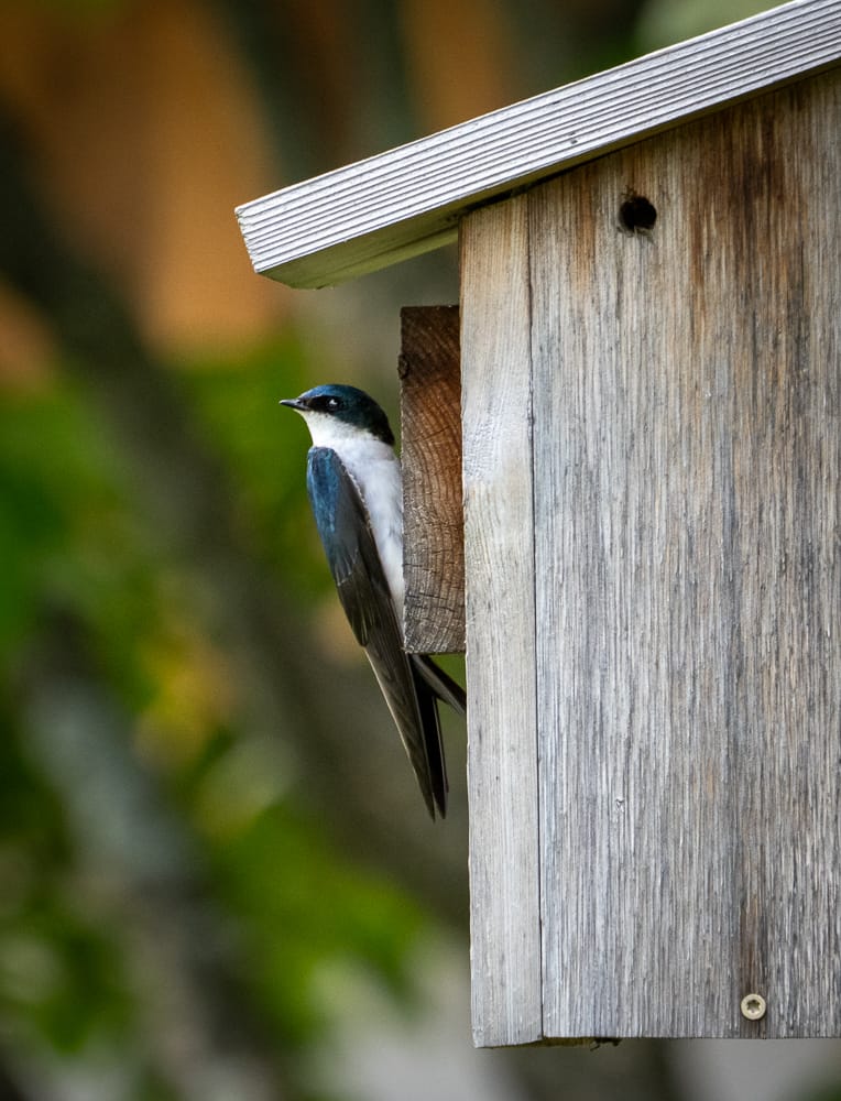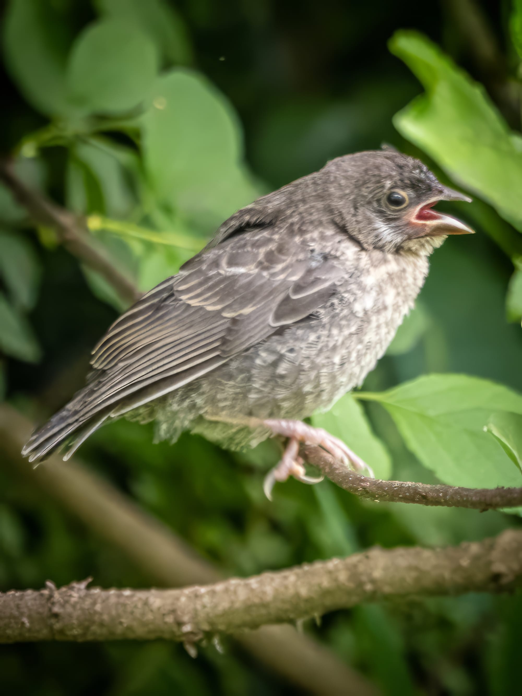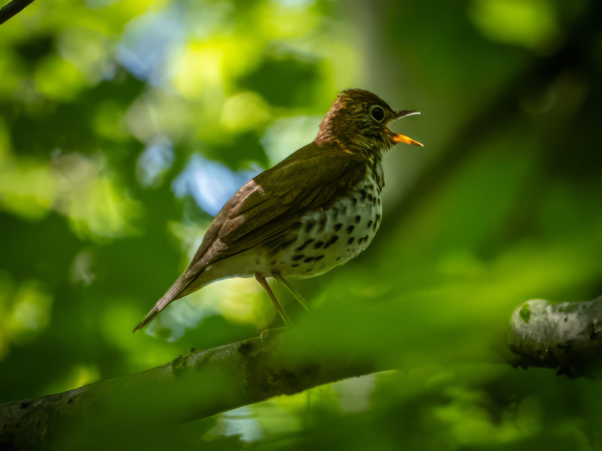 The Green Heron staring back at us from its nest. The second picture taken on a nice sunny day (an excuse to leave the nest unattended for a bit) shows us four eggs. Two pictures of a Wood Thrush on their nest in a Witch Hazel tree, and a Wood Thrush calling. The next two are tree swallows tending their young in one of the nest boxes. Next a fledgling Brown-headed Cowbird - a parasitic nester that lays their eggs in the nest of another species who then incubates them and raises their young. Next a fledgling Robin still holding on to a downy crest.