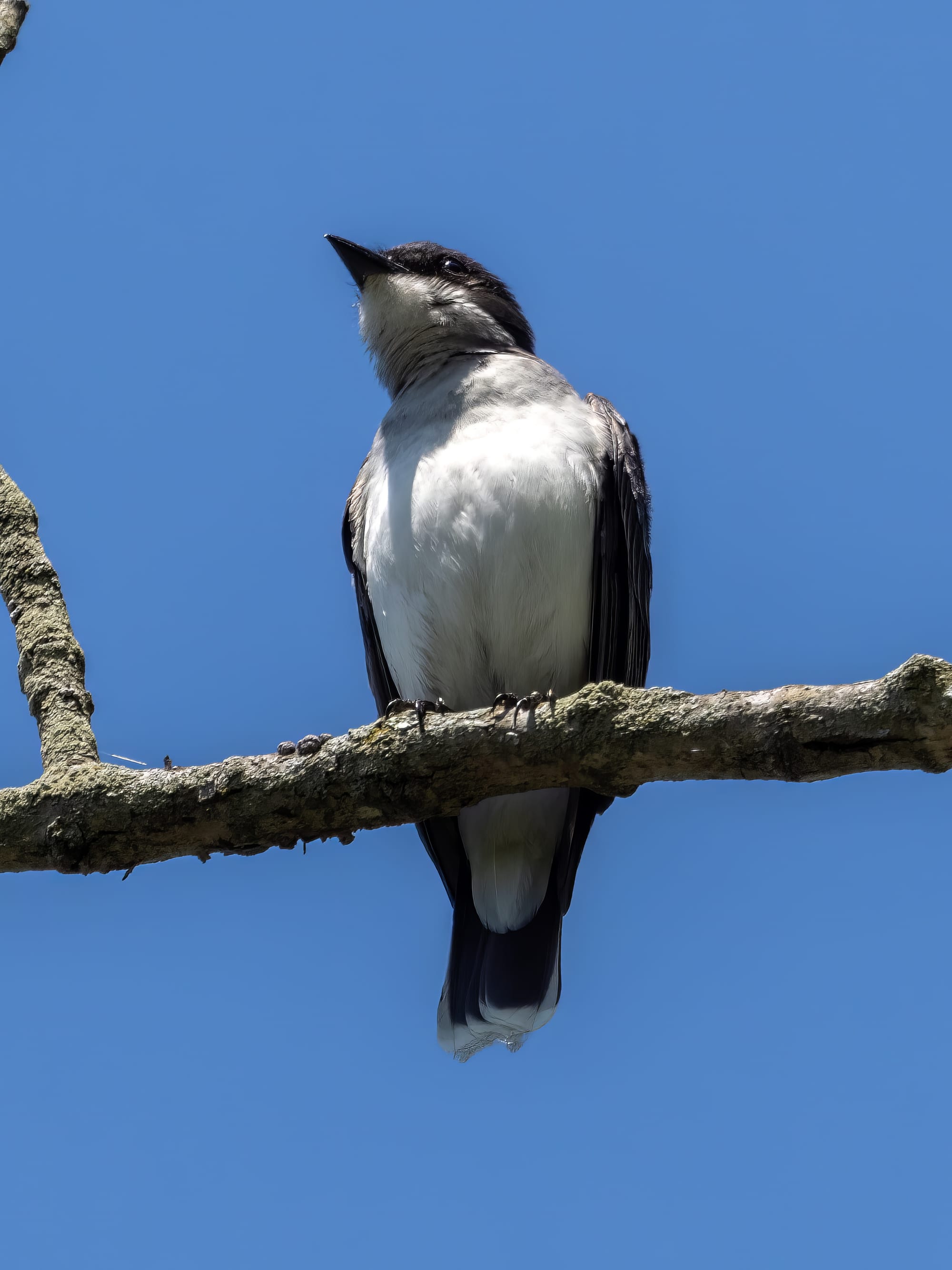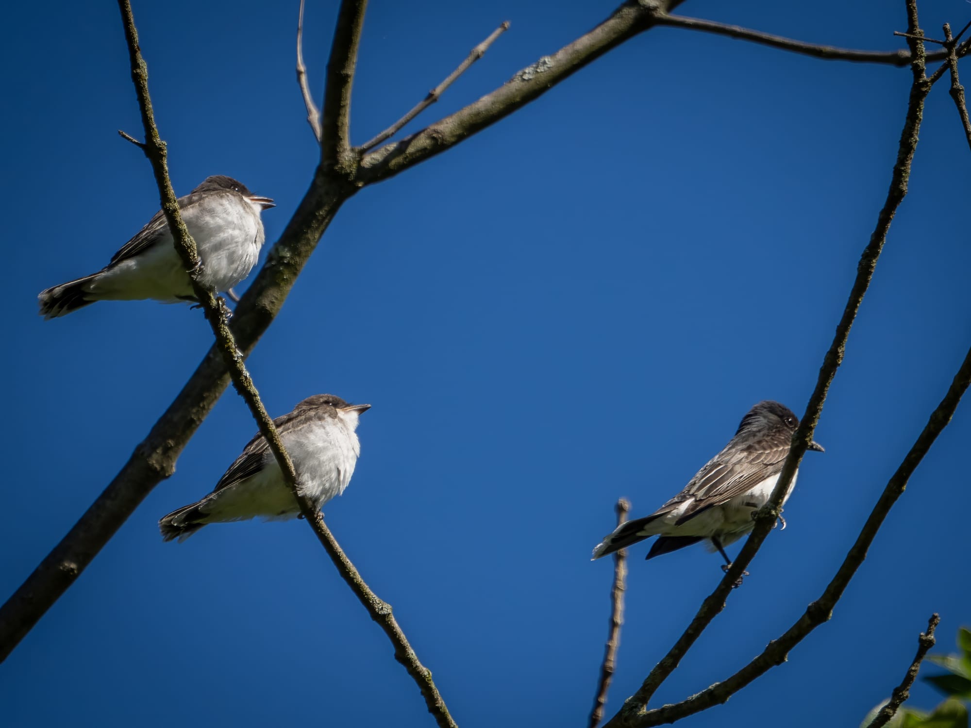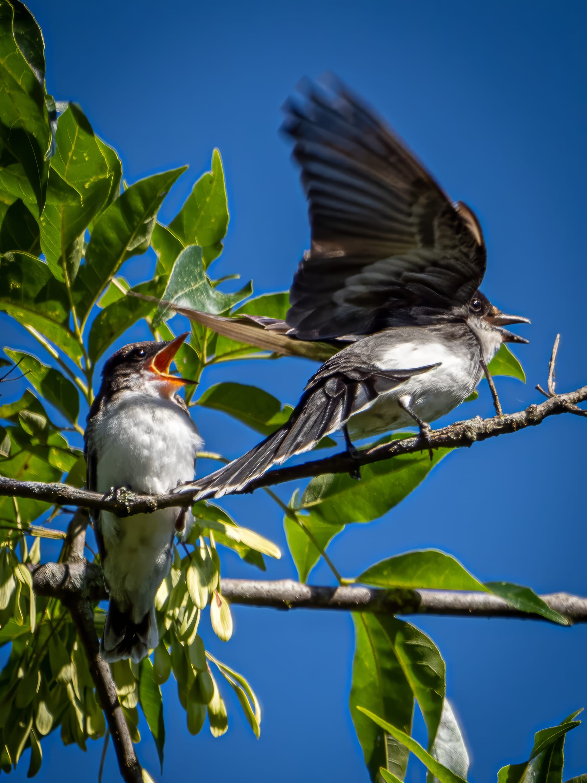 They build a substantial cup nest from 7 to 30 feet high in a tree. Two to five eggs hatch after 16 days. Both parents tend nestlings, that fledge in around 17 days. The fledglings may be spend the next month being fed by their parents (privileges of royalty I suppose?). Kingbirds depart for their wintering range by September.