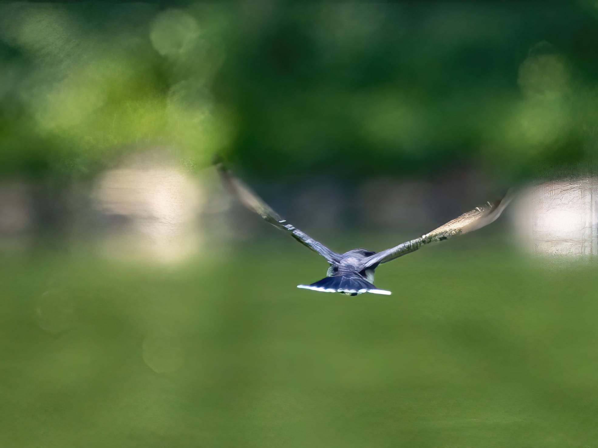 Kingbirds arrive in April and are easy to spot perched on trees near the ponds. These domineering birds are 8 inches long, dark gray and white with a white-tipped tail and a small red streak on the head. Kingbirds will dive bomb crows, hawks, and owls and may tumble a bit in a display of triumph once they drive them away.