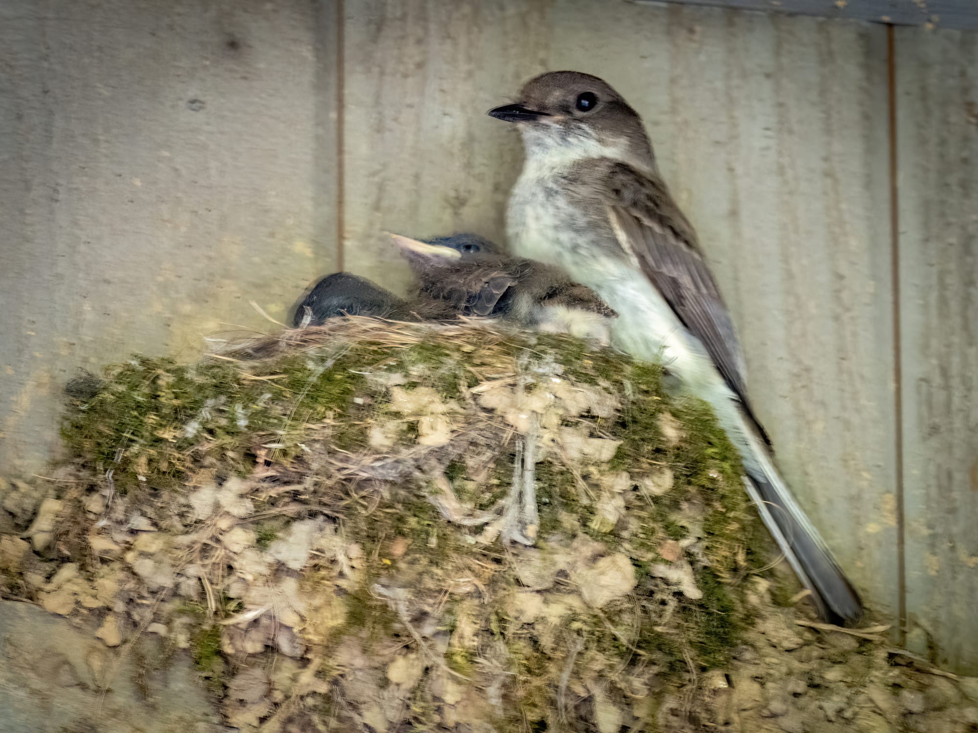 The usual clutch of three eggs hatch in 12-13 days. Both parents feed the young, who fledge around 14-18 days later. Blue jays are major predators. We can hear the wood-pewees song through September when they migrate wintering in the tropics from Panama to Bolivia.