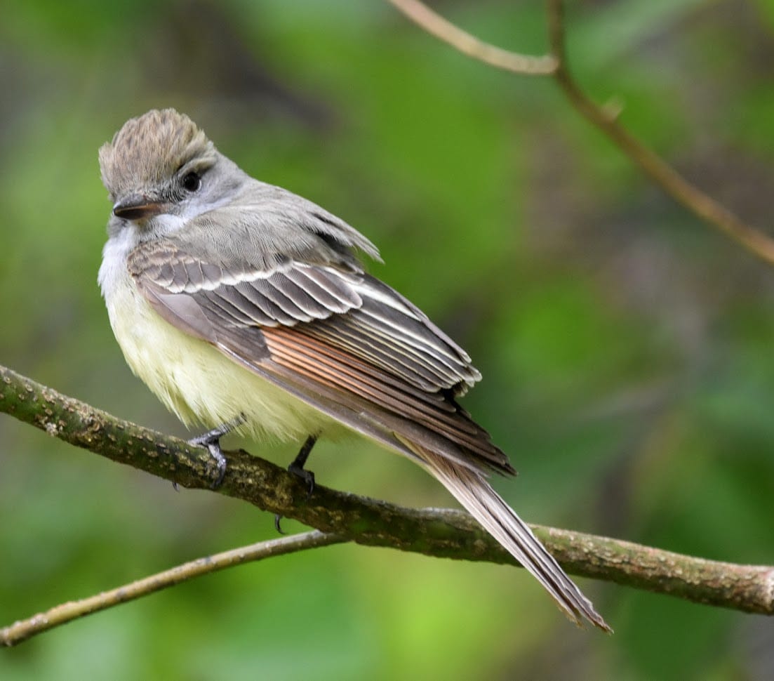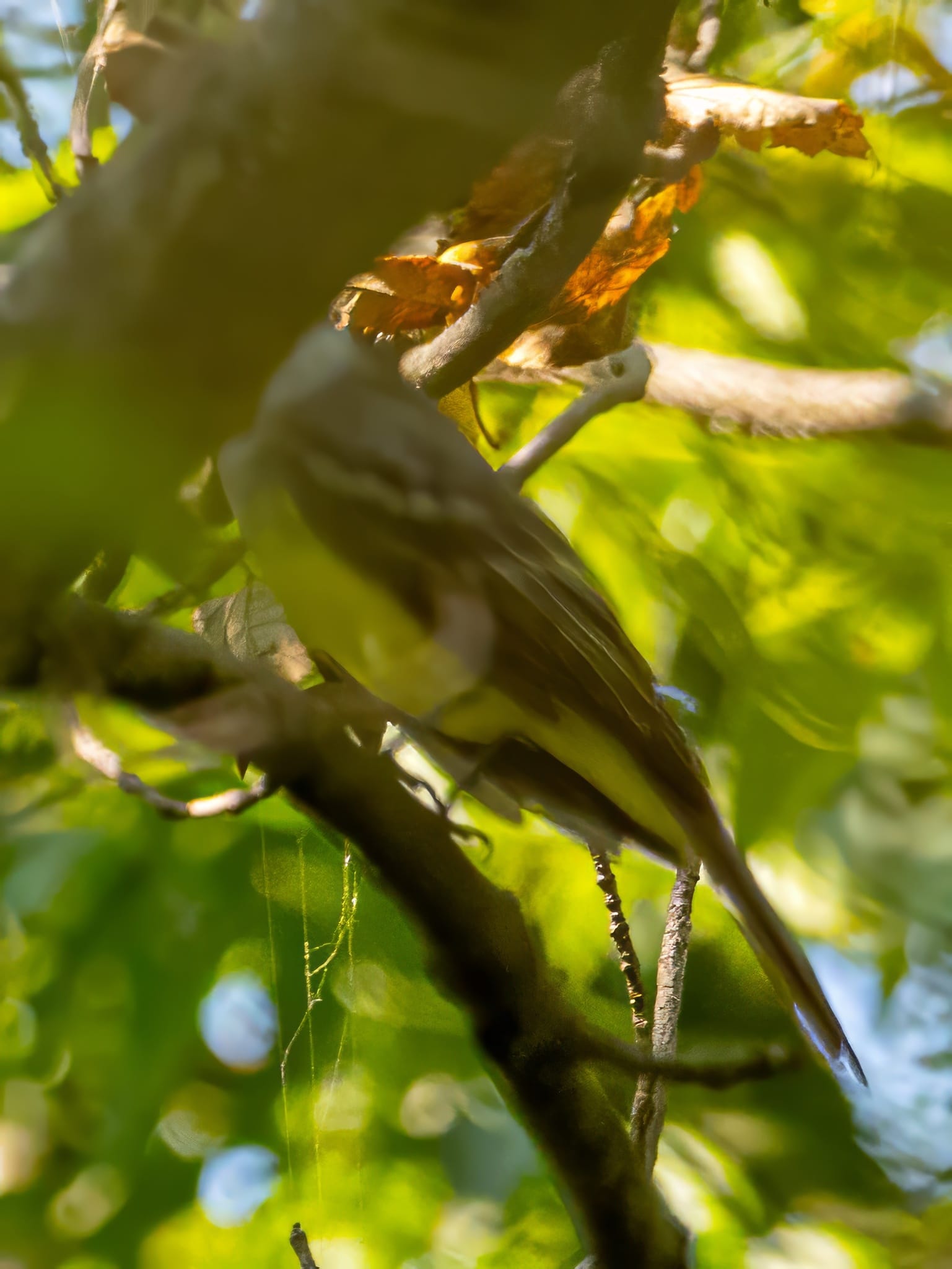 I know others have spotted or heard the great crested flycatcher many times at the park but I've only been able to get one lousy picture. It's the largest flycatcher we'll see at the park at 8-9 inches long, with a yellow belly, gray breast, and rusty red tail and wing feathers and a head crest they show when agitated.
