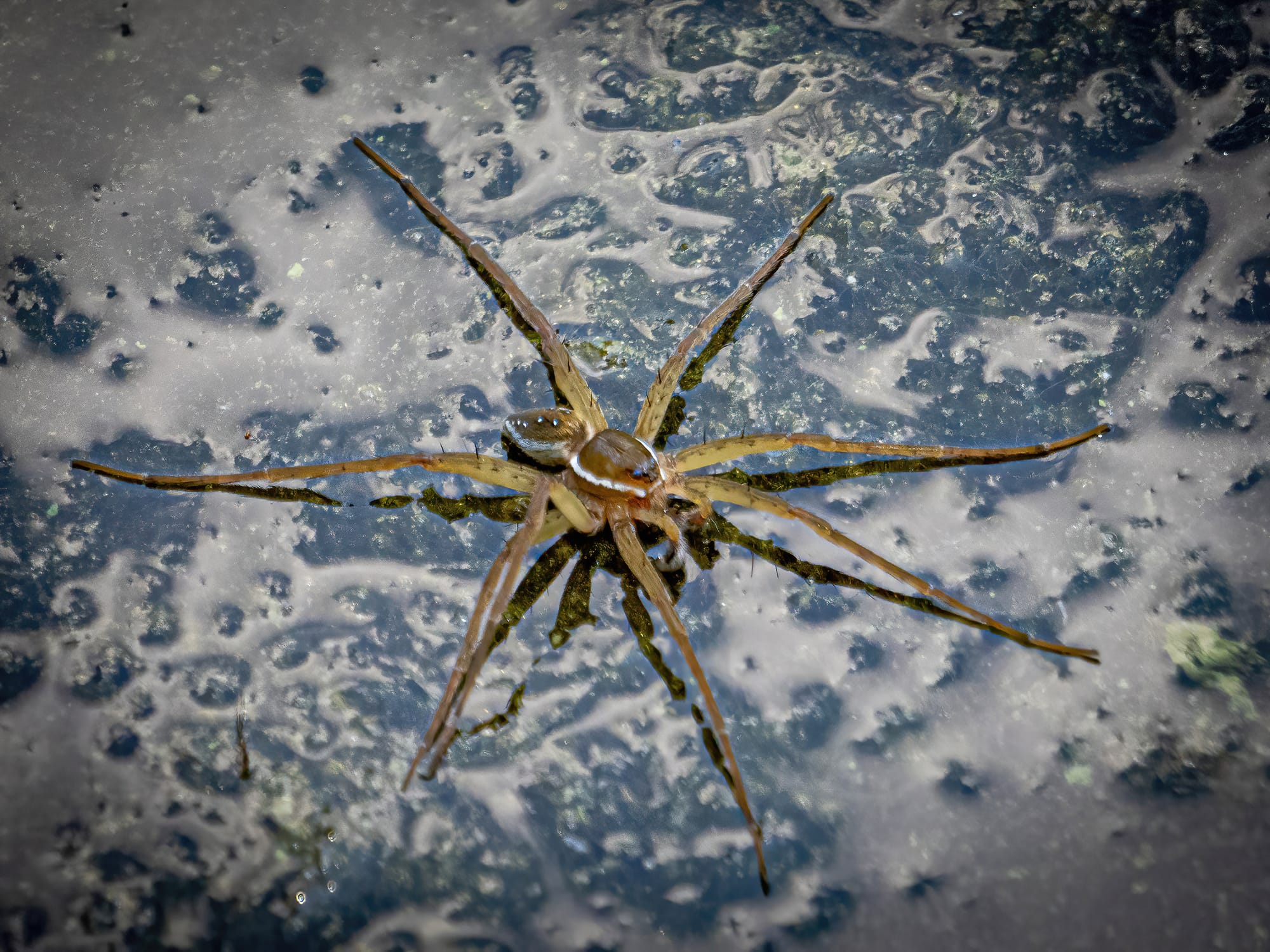 The water spiders at the park like the seven-eyed fishing spider evolved from ancestors that lived on the forest floor, moved to the water, and developed the adaptations that makes the surface of the pond into a giant hunting web.