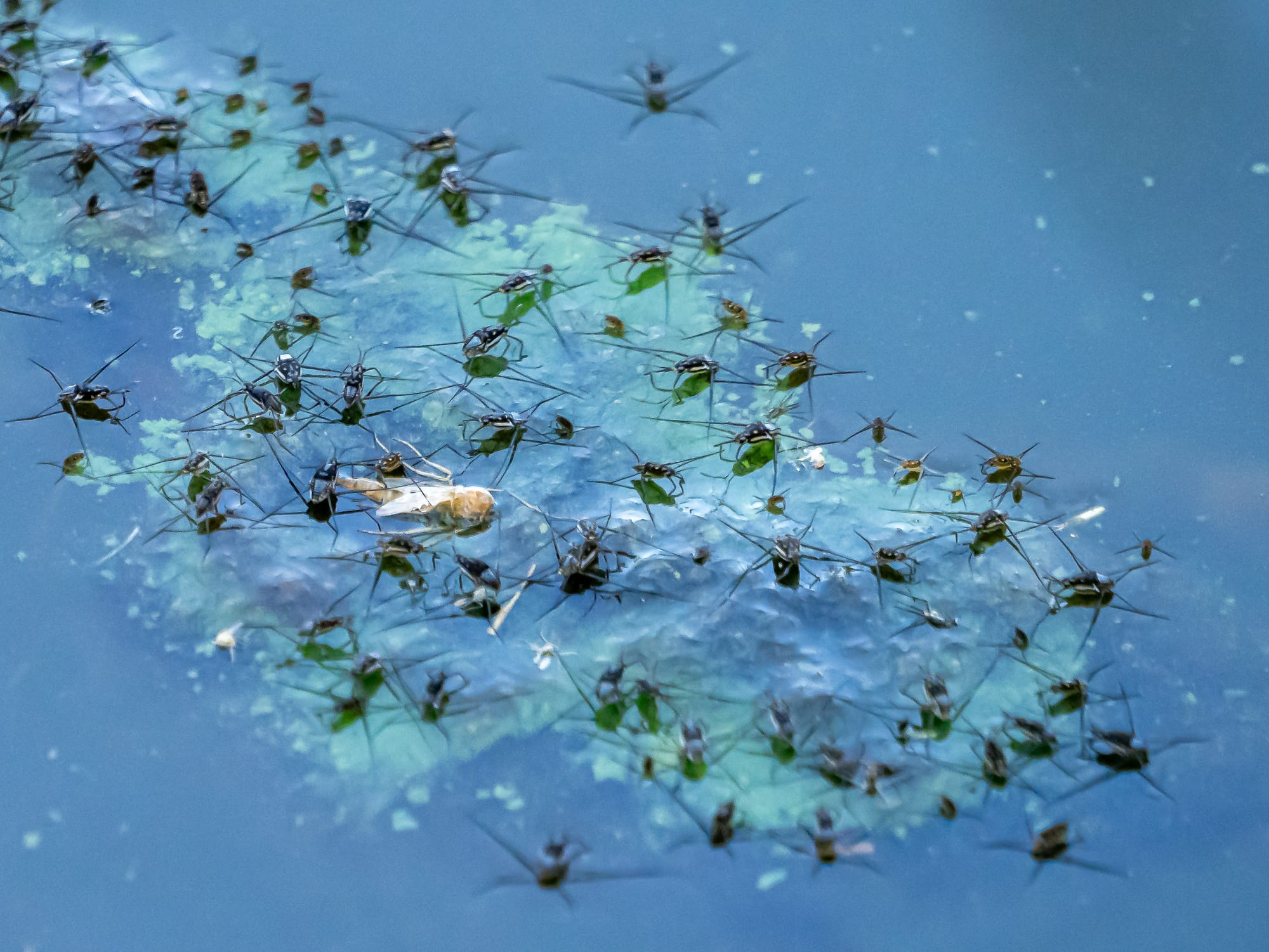 The ponds are home to a different water strider species trepobates a much smaller water strider that you'll often see in large groups. I've yet to see them this year, but they should show up before long.