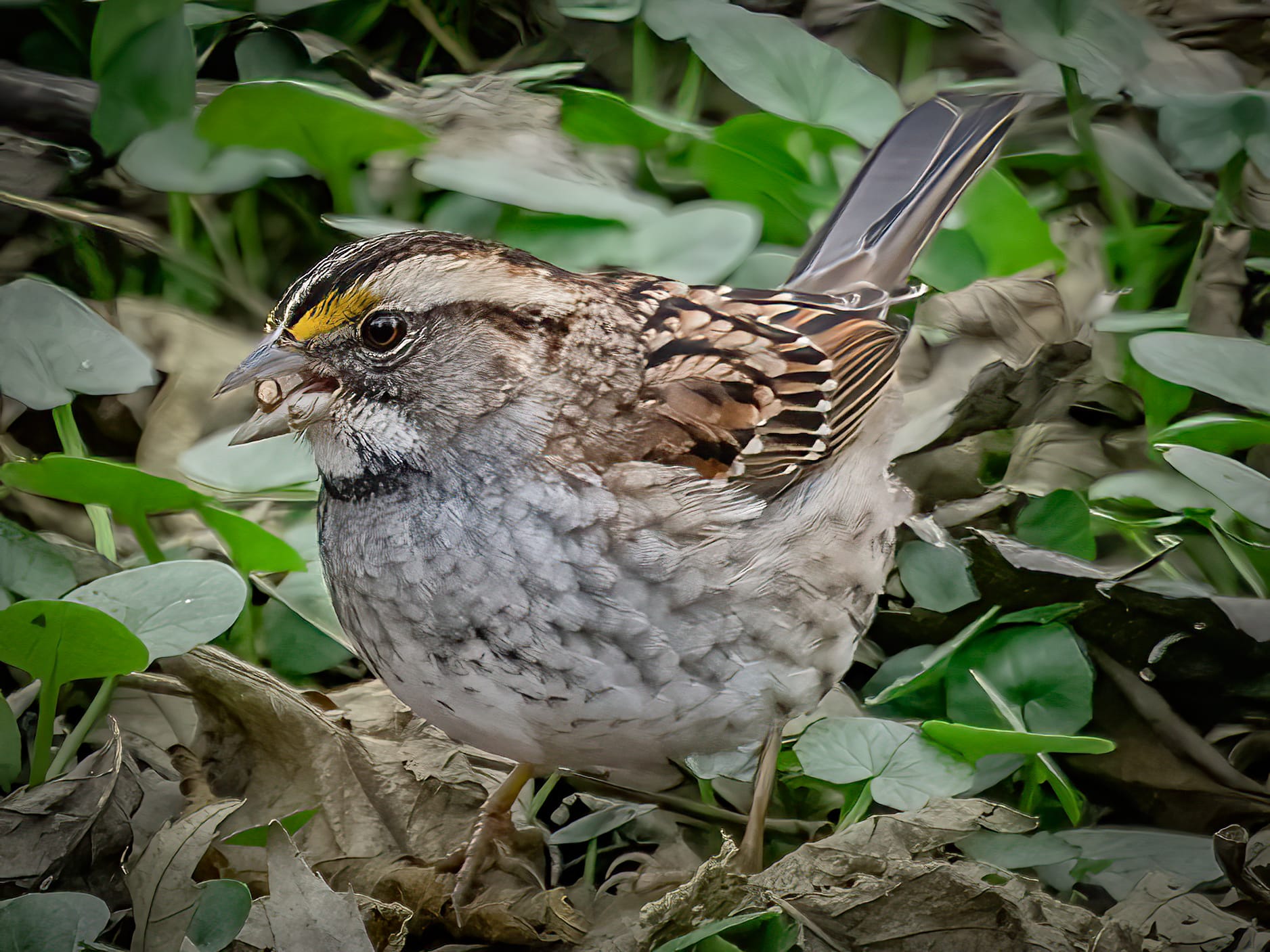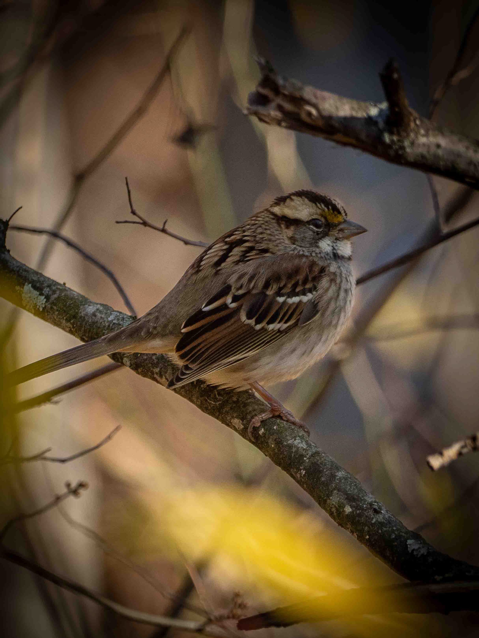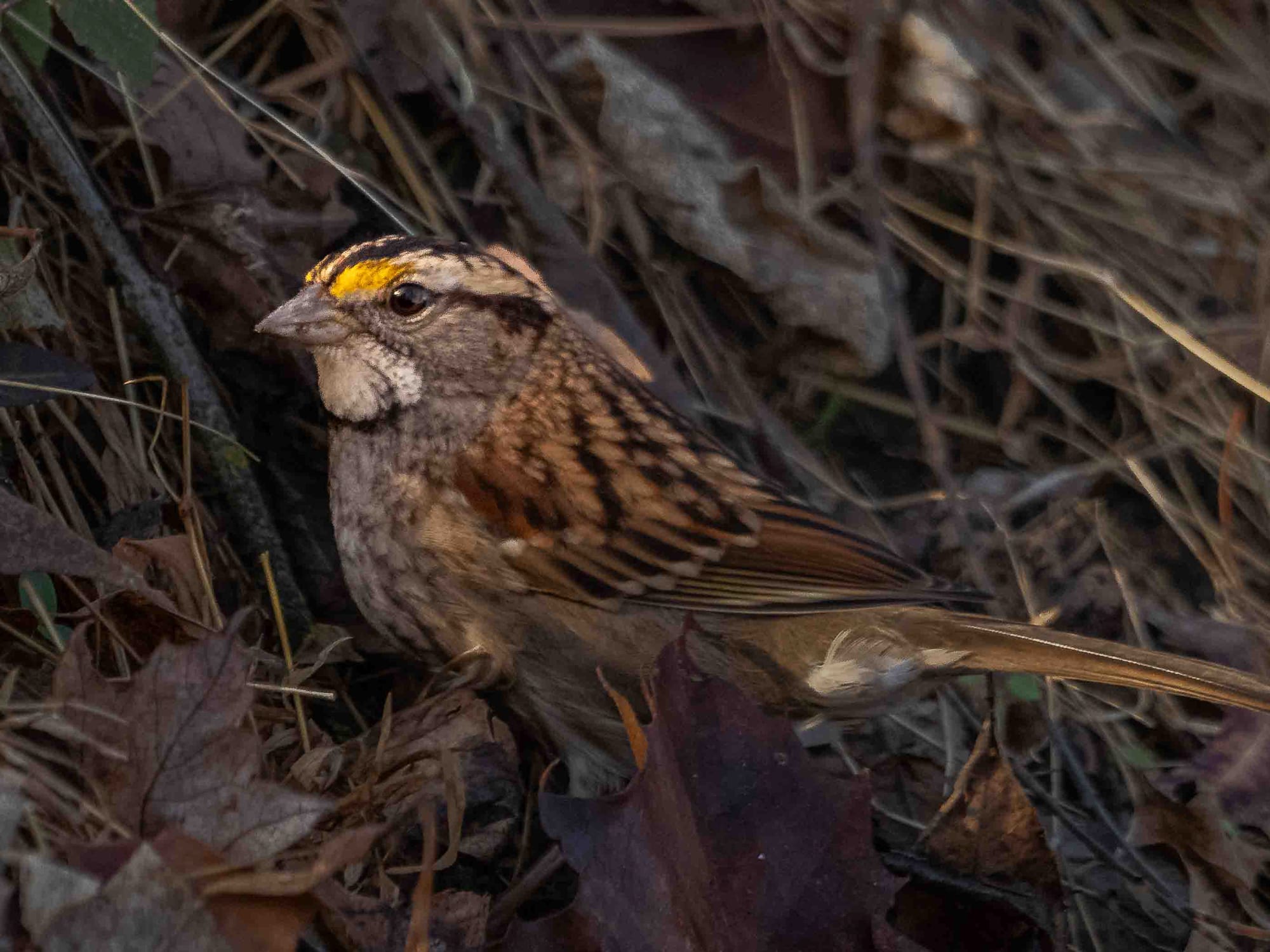 The first “tribe” takes shape when White-throated Sparrows and the eastern Slate-colored form of the Dark-eyed Junco move south from their northern breeding grounds. Throughout the winter they will comb through brushy woodland edges and mixed thickets close to the ground where food is abundant. They spend the day hopping and scratching leaf litter to uncover seeds, fallen fruits, and occasional invertebrates. They stick to sheltered thickets of shrubs and tangled stems to avoid predators and stay out of the wind.