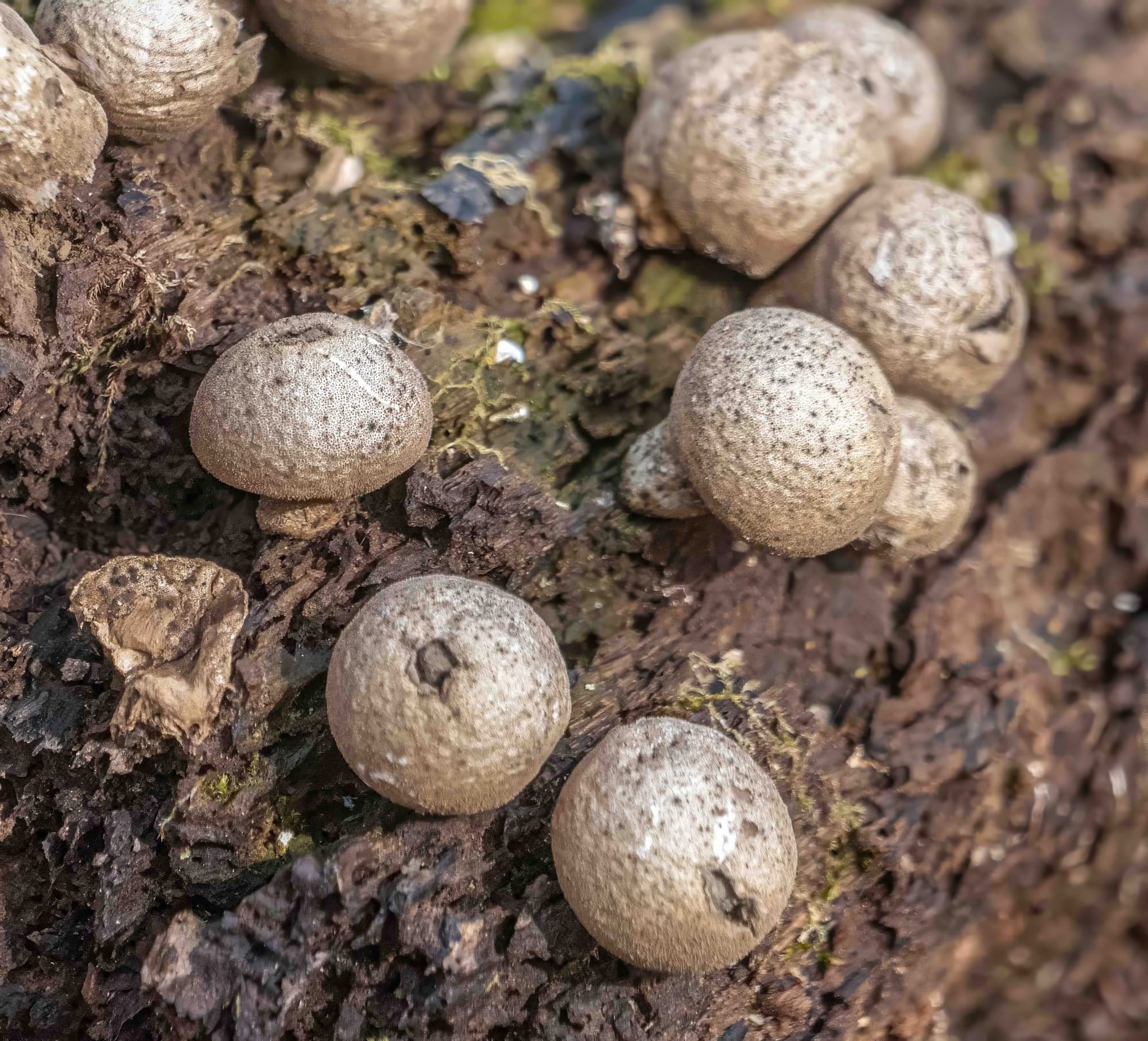 The genus Lycoperdon has about 50 species of small puffballs. The genus name comes from Greek - "lyco" means wolf, and "perdon" means to break wind, giving us the wolf-fart puffball. When mature, the puffball forms a pore-like opening on top and can puff out spores when disturbed.